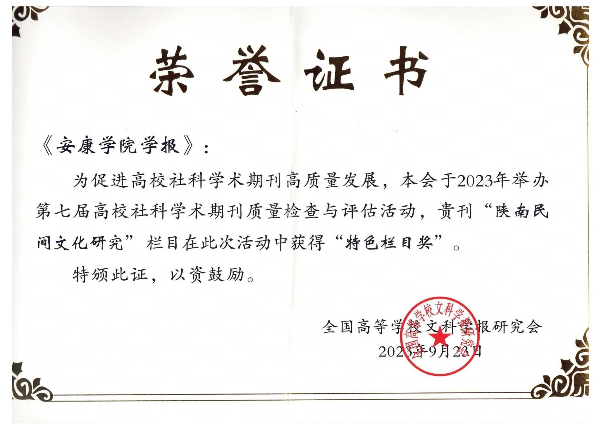 9月22日至24日,全国高等学校文科学报研究会成立35周年庆祝大会暨九届三次理事会会议在湖北宜昌举行。会议公布了第七届高校社科学术期刊质量检查与评估结果。《ac米兰官方网站学报》“陕南民间文化研究”栏目获“特色栏目奖”。