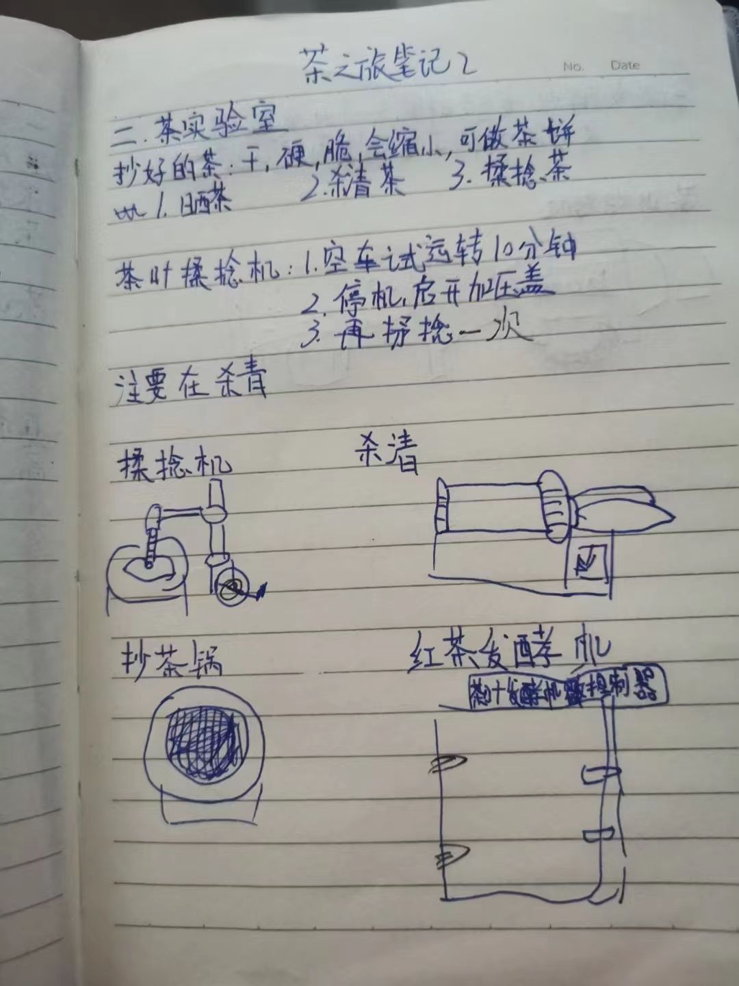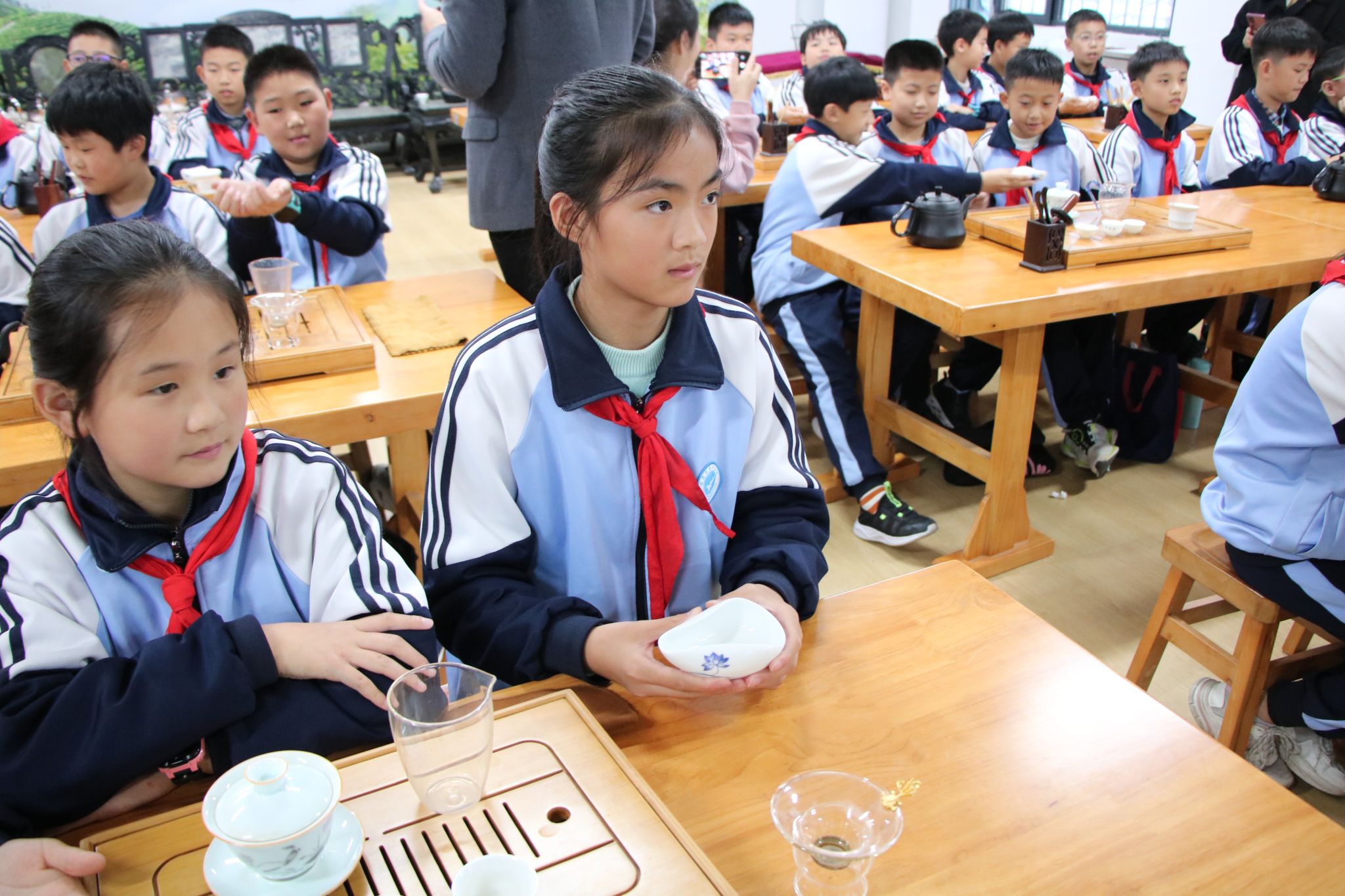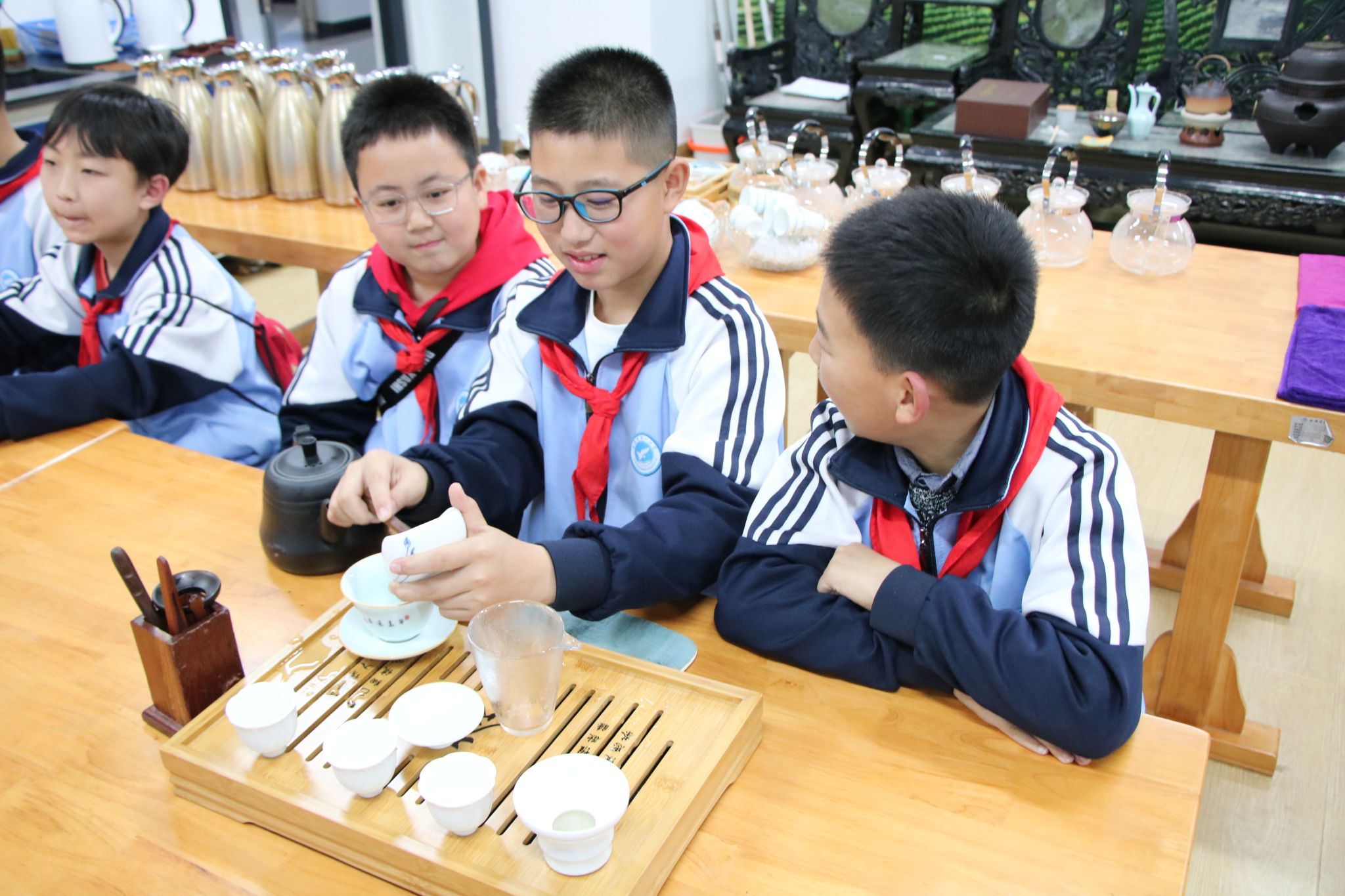 在茶园,吴冲和程晓梅老师为队员们讲解了茶树的形态、种植栽培及茶叶采摘的相关知识;在茶叶加工实验室,吴冲老师介绍了各种茶的加工流程,并讲解了各种加工机器的用途;在茶艺室,马瑛老师介绍了各种茶具,展示了盖碗茶艺,介绍了常用的茶礼仪知识。