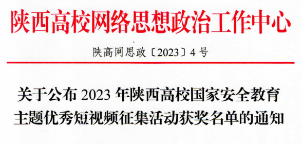 近日,由陕西高校网络思想政治工作中心主办的“2023年陕西高校国家安全教育主题优秀短视频征集活动”结果揭晓,ac米兰易班发展中心推荐的学生原创短视频作品,荣获三等奖三部(团队)、优秀奖两部(团队)。