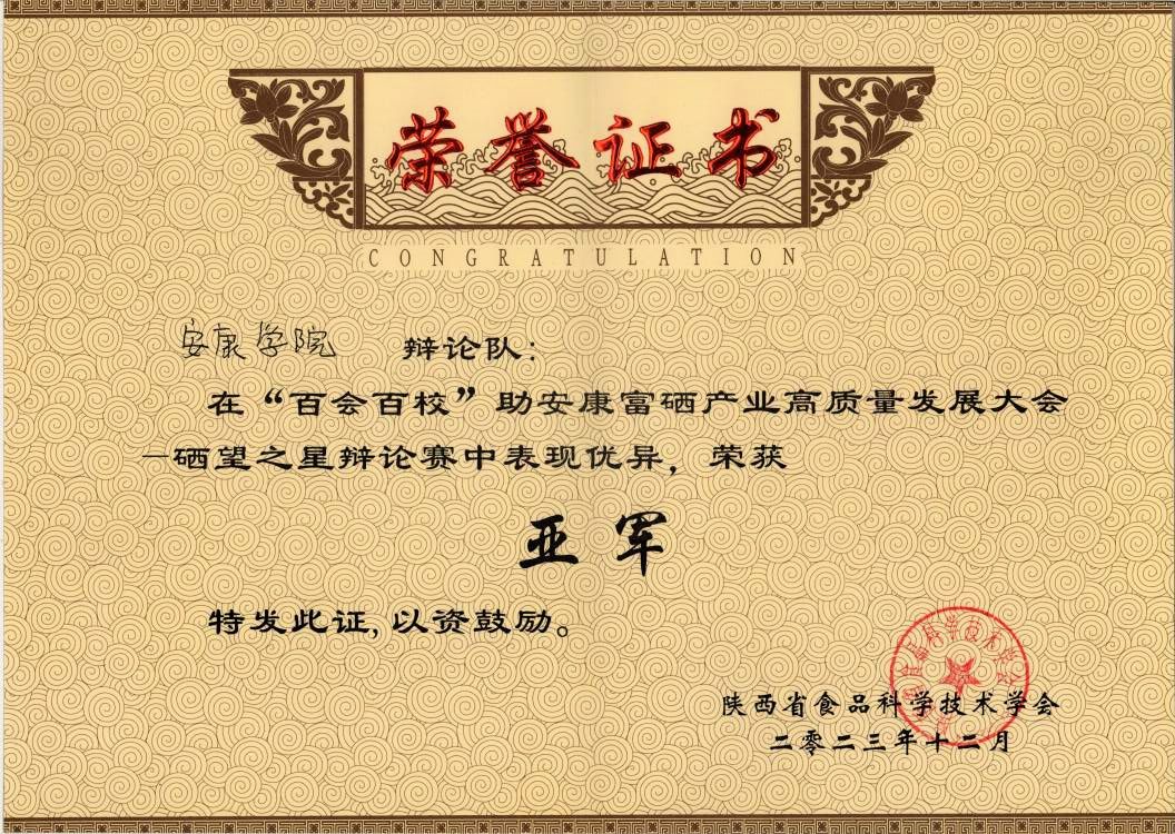 本次活动由省科协、安康市委、市政府主办,省食品科学技术学会、安康市科协、石泉县委、石泉县政府承办。大会开设专场“硒望之星”大学生辩论赛,ac米兰食品科学与工程专业2022级李心静、孙瑜欣、史佳欣和卜晨阳组队参赛。决赛中,ac米兰代表队以“石泉预制菜产业高质量发展主要依靠企业科技创新(反方)”为论点,与西安交通大学代表队展开激烈论辩,最终荣获亚军。