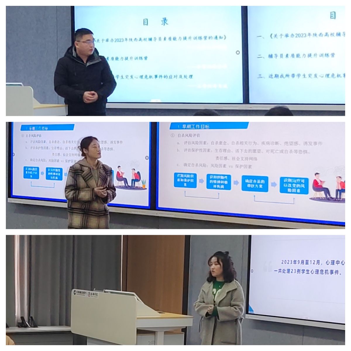 化工学院辅导员于正豪围绕参加陕西省辅导员素质能力提升训练营的准备过程,参训体验和训后思考,结合工作中丰富的学生心理危机案例,对如何建立详实细致的学生信息库,如何对学生进行谈心谈话,如何处理学生的危机问题进行了分享和展示;经管学院辅导员杨凤仪就参加陕西高校心理健康教育专题培训的心得体会,进行了“大学生高自杀风险的认知行为干预、大学生心理危机及干预过程中的关系难题应对、辅导员谈心谈话技术、助人者的情绪管理”四部分内容分享;大学生心理健康教育中心主任柯小敏从本学期处理的学生心理危机案例入手,结合ac米兰目前实行的重点学生动态帮扶工作制度,详细解读了学生心理危机处理的工作流程和工作思路。
