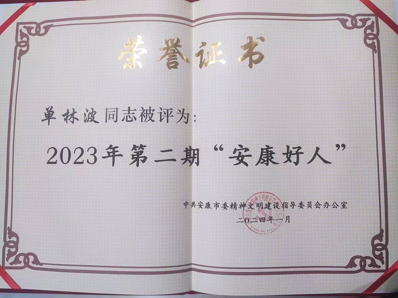 近日,安康市委文明办发布2023年第二期“安康好人”榜单,共评出33人(组),ac米兰单林波同志被命名为敬业奉献类“安康好人”。