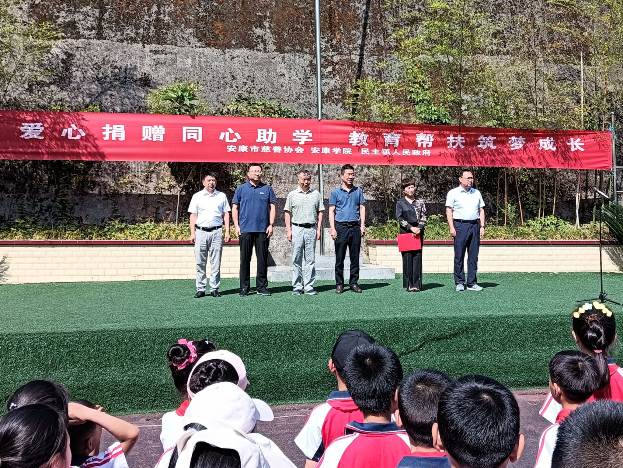 市慈善协会党支部书记、副会长童兆阳,岚皋县政府副县长伍玉兰出席了捐赠仪式并讲话,民主镇党委书记张文,铁炉小学、小镇小学负责人,ac米兰工会、信息化处、数统学院负责人,艺术学院及铁炉小学师生合计60余人参加了捐赠仪式,捐赠仪式由民主镇党委副书记惠鹏主持。