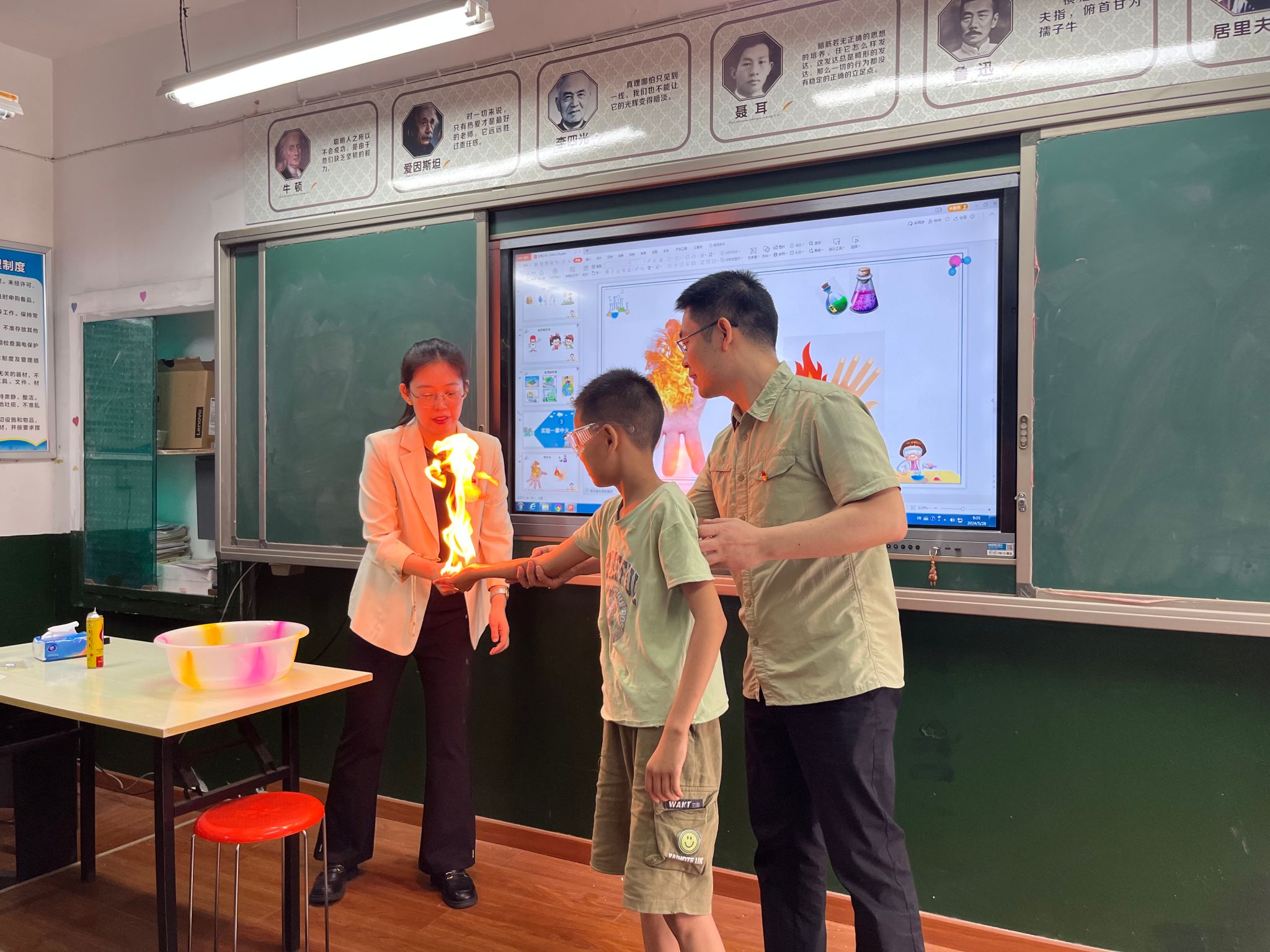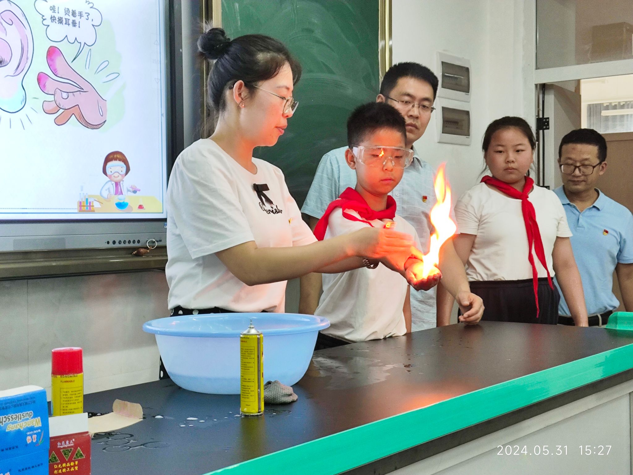 王雪老师向同学们科普了“什么是化学?”“化学的作用是什么?”。科普团的老师们向小朋友们演示实验操作,生动有趣的化学实验现象激发了孩子们的兴趣,大家都迫不及待地纷纷亲自上手操作。在老师们的带领下,孩子们积极参与了“掌中火”“神奇的色彩”“无中生有”等实验,在轻松有趣的氛围下,走进化学的世界,感受化学的魅力。