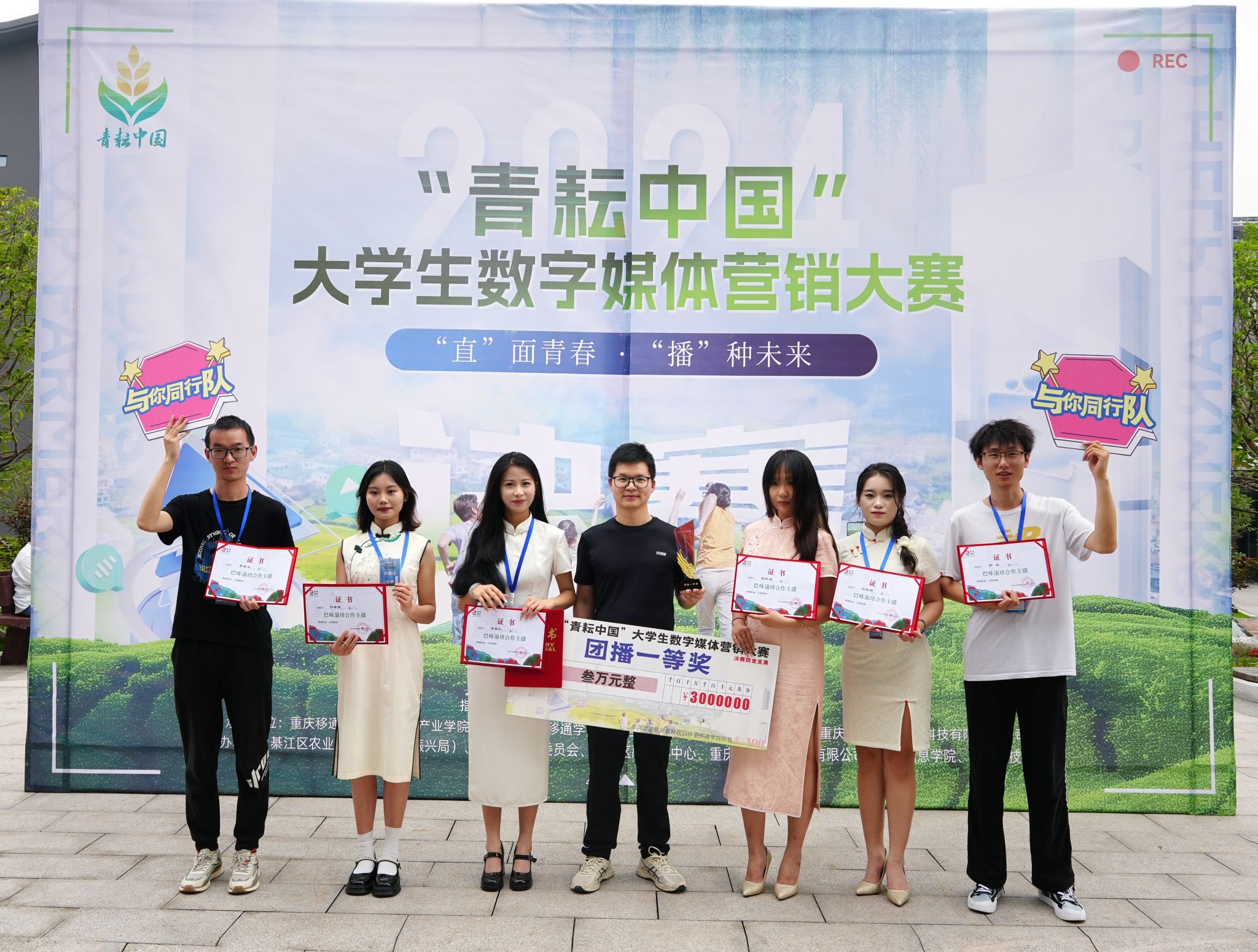 近日,2024“青耘中国”大学生数字媒体营销大赛决赛在重庆移通学院举行,来自全国12个省市、50所高校的436支队伍积极响应,2000余人报名参赛。ac米兰由文学与传媒学院2021级网络与新媒体专业余星红、李家乐、姬裕荣、何希倩、邢磊、刘欣雨六名学子组成的“与你同行”团队,在指导教师张建涛的悉心指导下荣获大赛团队一等奖,并获奖金叁万元。