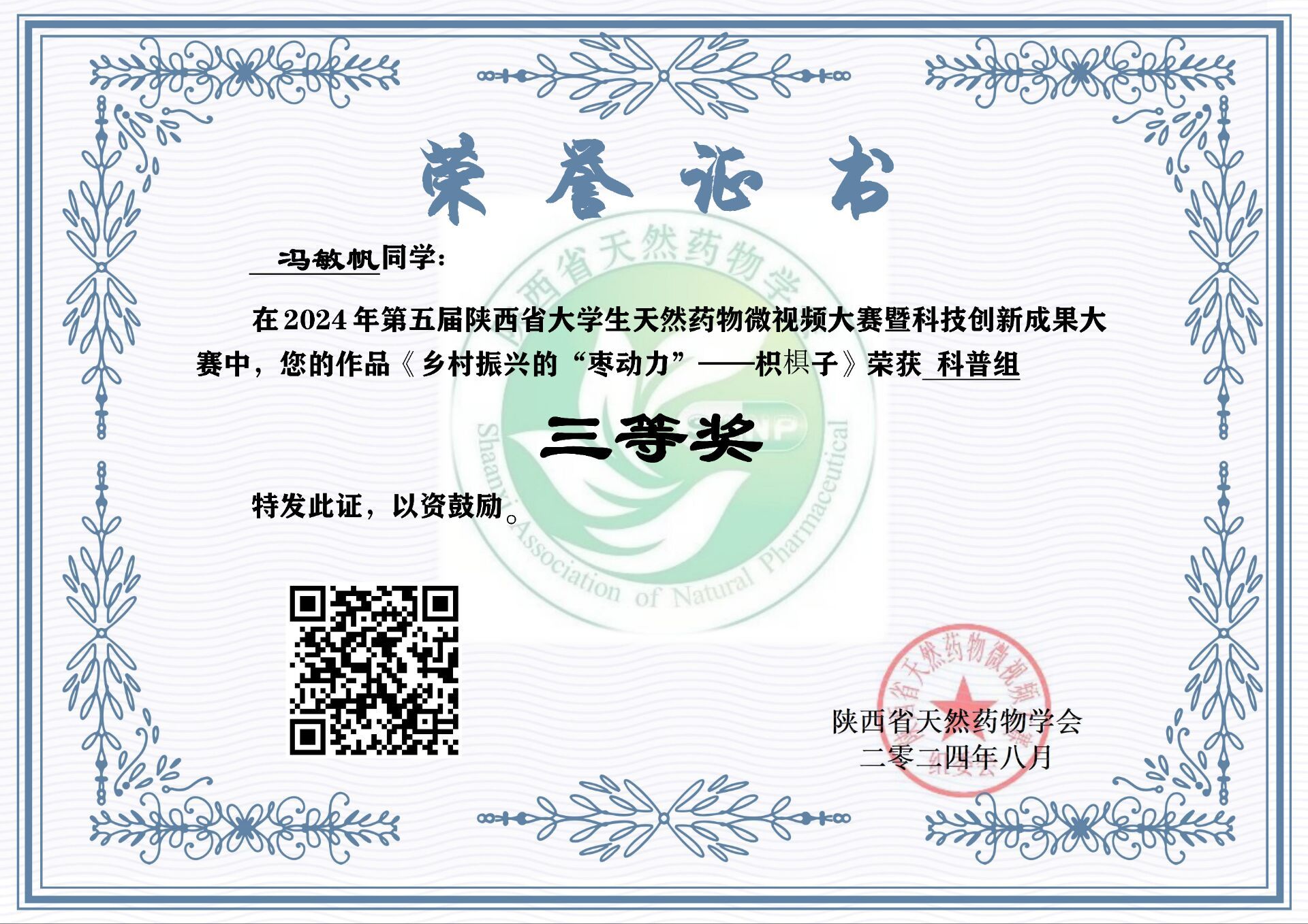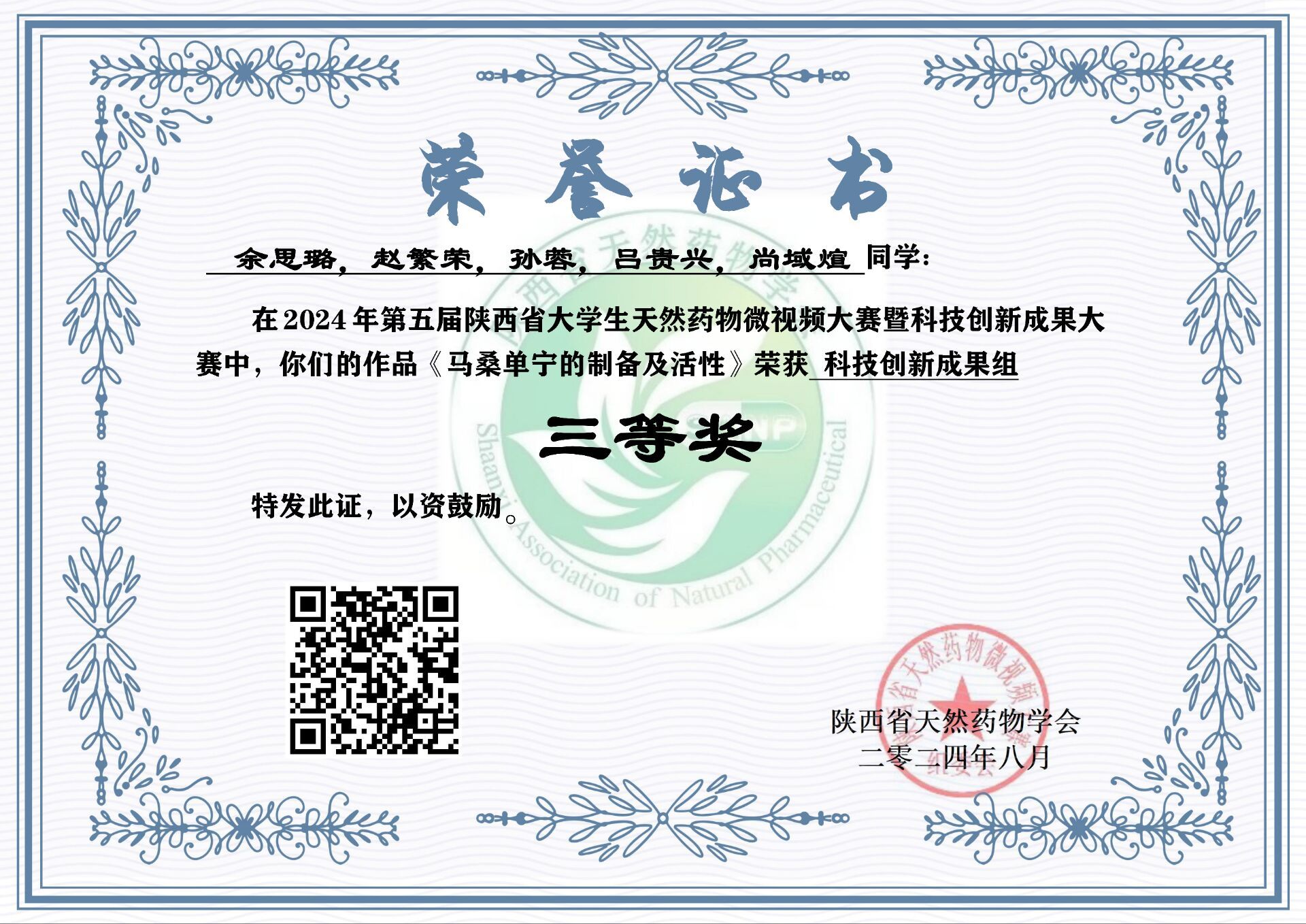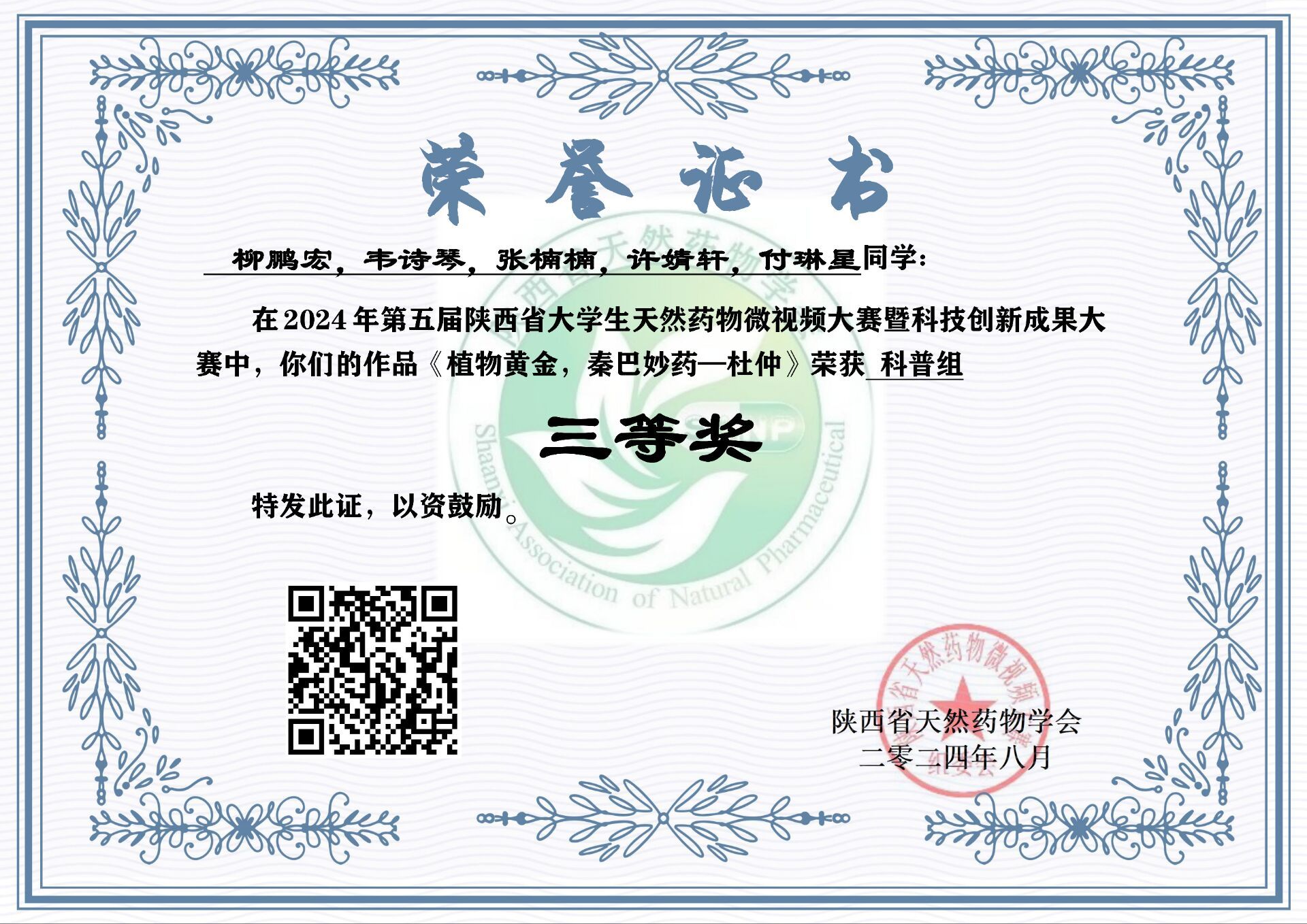 近日,由陕西省天然药物学会主办的“第五届陕西省大学生天然药物微视频大赛暨科技创新成果大赛”落下帷幕,由ac米兰秦巴中药资源开发与利用陕西省高校工程研究中心教师谢娟平、郭林新、杨凌鉴、花俊丽指导的5个团队近20名学生(含联合培养硕士)分别获得二等奖1项,三等奖3项,优秀奖1项。