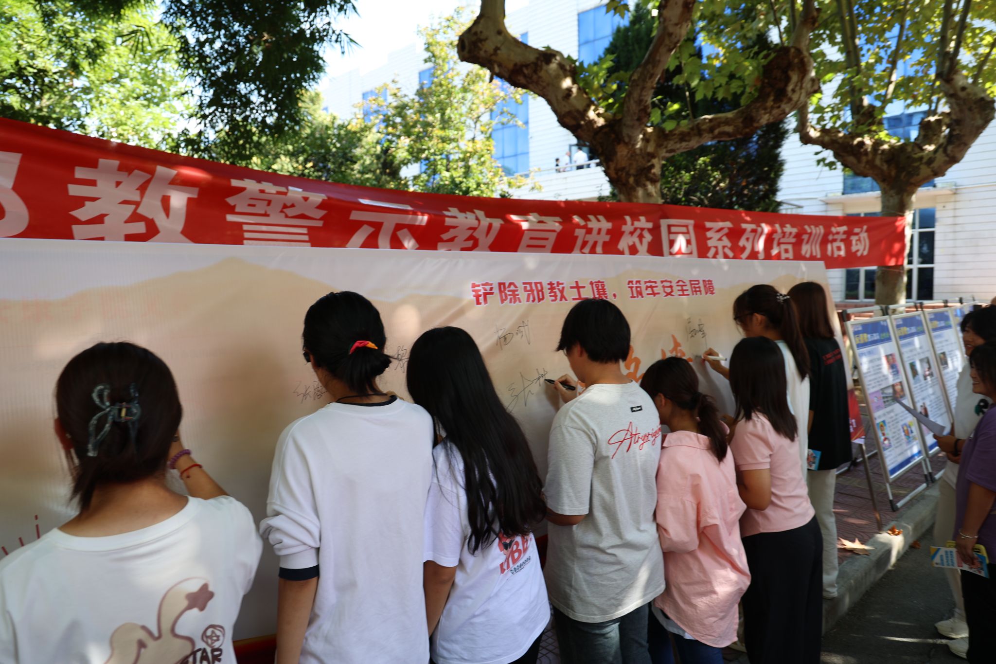 活动现场通过反邪教宣传展板、宣传展台、发放宣传资料、现场签名等形式,向师生普及反邪教有关法律法规,进一步提升广大师生识邪、防邪、反邪的意识和能力。