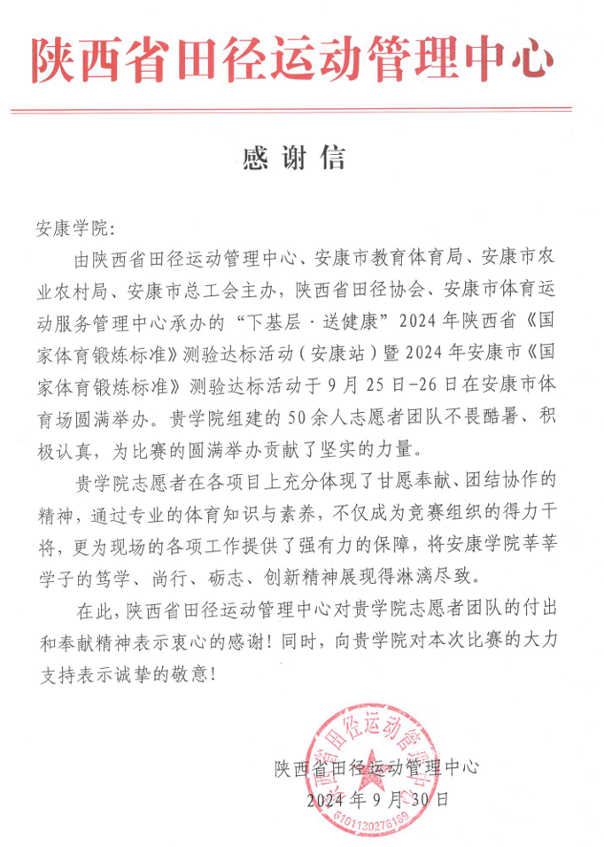近日,2024年陕西省国家体育锻炼标准测验达标活动(安康市站)暨2024年安康市《国家体育锻炼标准》测验达标活动在安康市体育场举行,ac米兰体育学院60名学生参加作为裁判员和运动员应邀参加,圆满完成了裁判工作和参赛项目,受到了主办方和相关领导的一致好评,充分展现了ac米兰学生良好的专业素养和精神风貌。