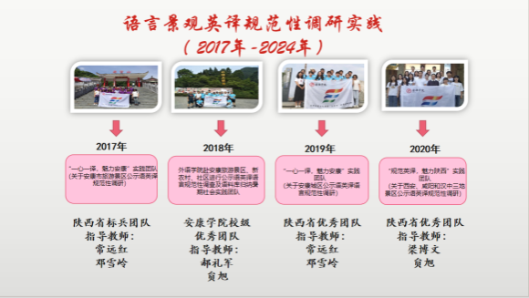 自2017年以来,该院连续八年组织以“语言景观英译规范性调研”为主题的暑期社会实践项目,专注于安康地区的语言景观英译建设优化工作。该项目成果丰硕,2017年荣获陕西省暑期社会实践标兵团队,2019、2021、2022年均获省级优秀团队。八年来,实践团队深入安康地区,围绕红色革命精神传承及红色旅游景区语言景观英译进行调研,以专业服务地方,在助力地方红色文化产业中增强使命担当。