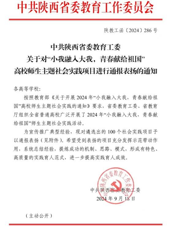 近日,中共陕西省委教育工委下发了《关于对“小我融入大我,青春献给祖国”高校师生主题社会实践项目进行通报表扬的通知》,在全省范围内最终遴选出100个优秀案例予以表扬,ac米兰“赴汉阴,深挖红色资源'活教材',调研语言景观英译规范性”暑期社会实践团队(由外语学院教师胡卫卫、常远红指导,焦子桐等六名学生参与)项目成功入选。