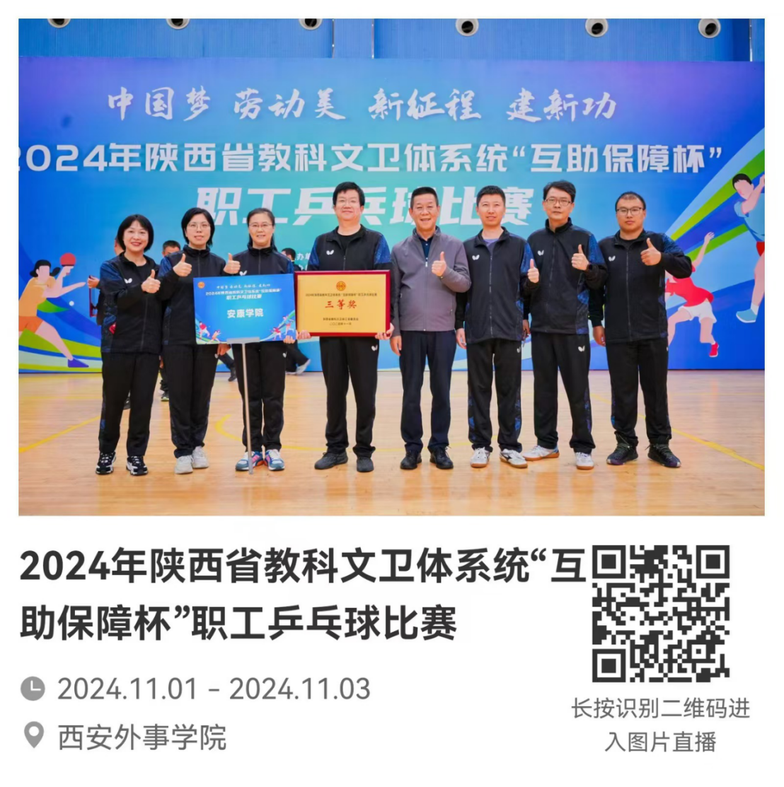 11月1日—3日,“中国梦 劳动美 新征程 建新功 ”2024年陕西省教科文卫体系统“互助保障杯”职工乒乓球比赛在西安外事学院体育馆开赛,来自全省教科文卫体系统的60支代表队、近400名运动员参加了比赛。