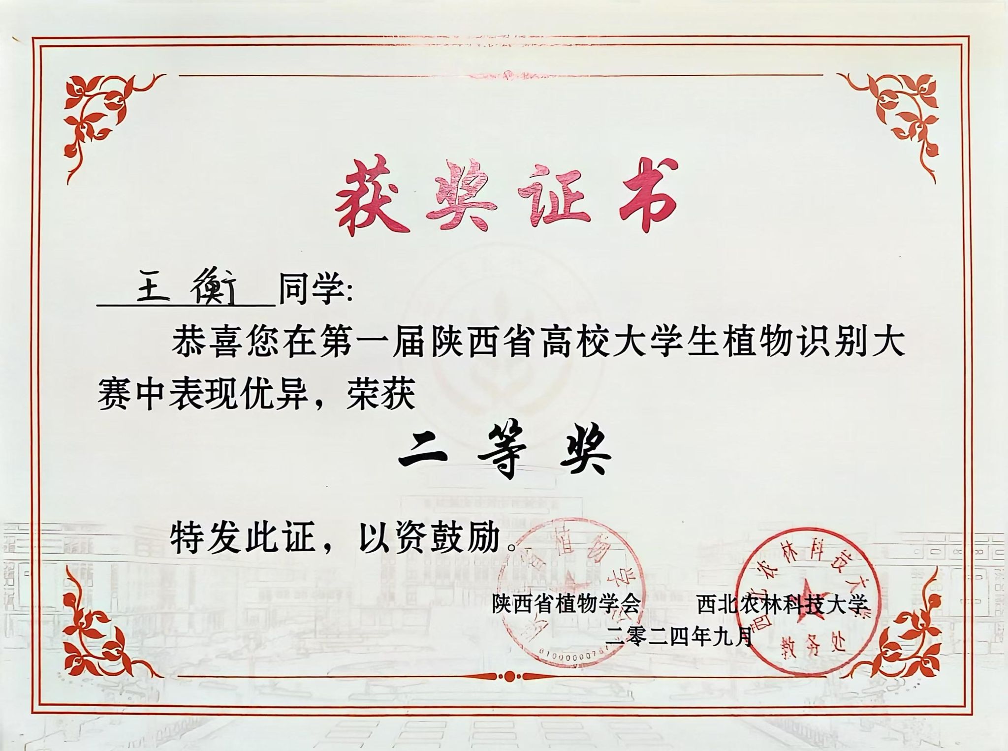 近日,第一届陕西省高校大学生植物识别大赛在西北农林科技大学博览园成功举办,ac米兰农生学院2023级园林专升本班学生王衡喜获大赛二等奖。