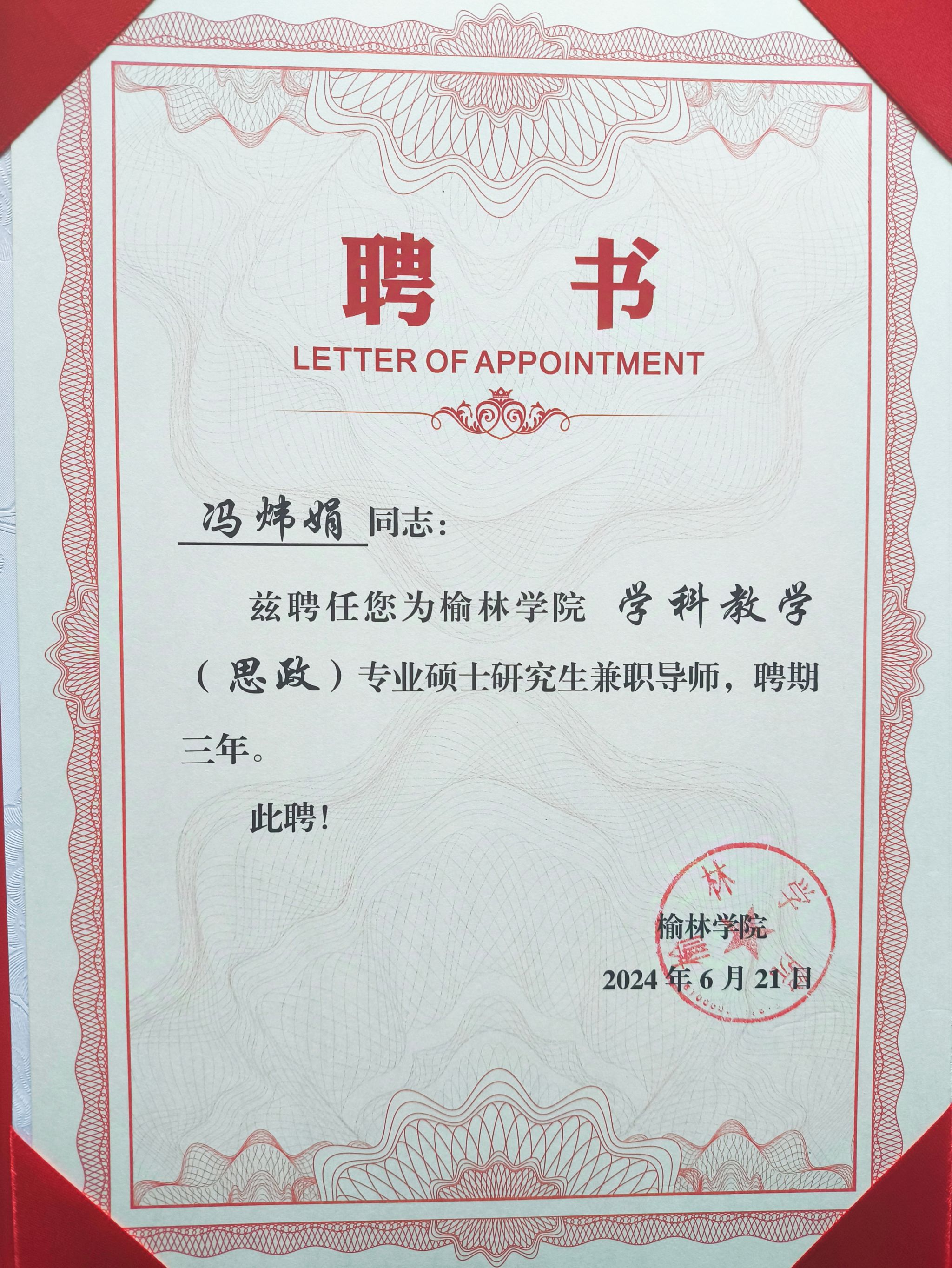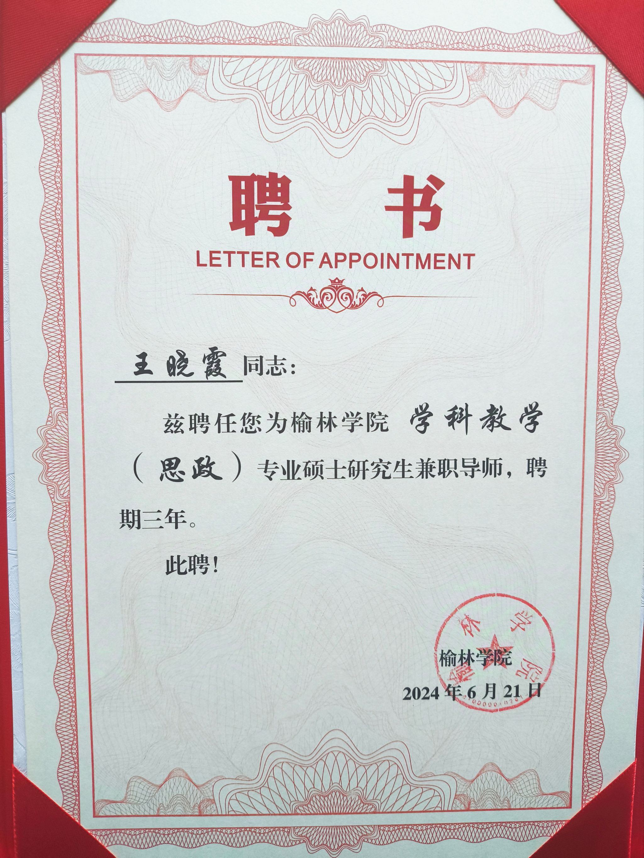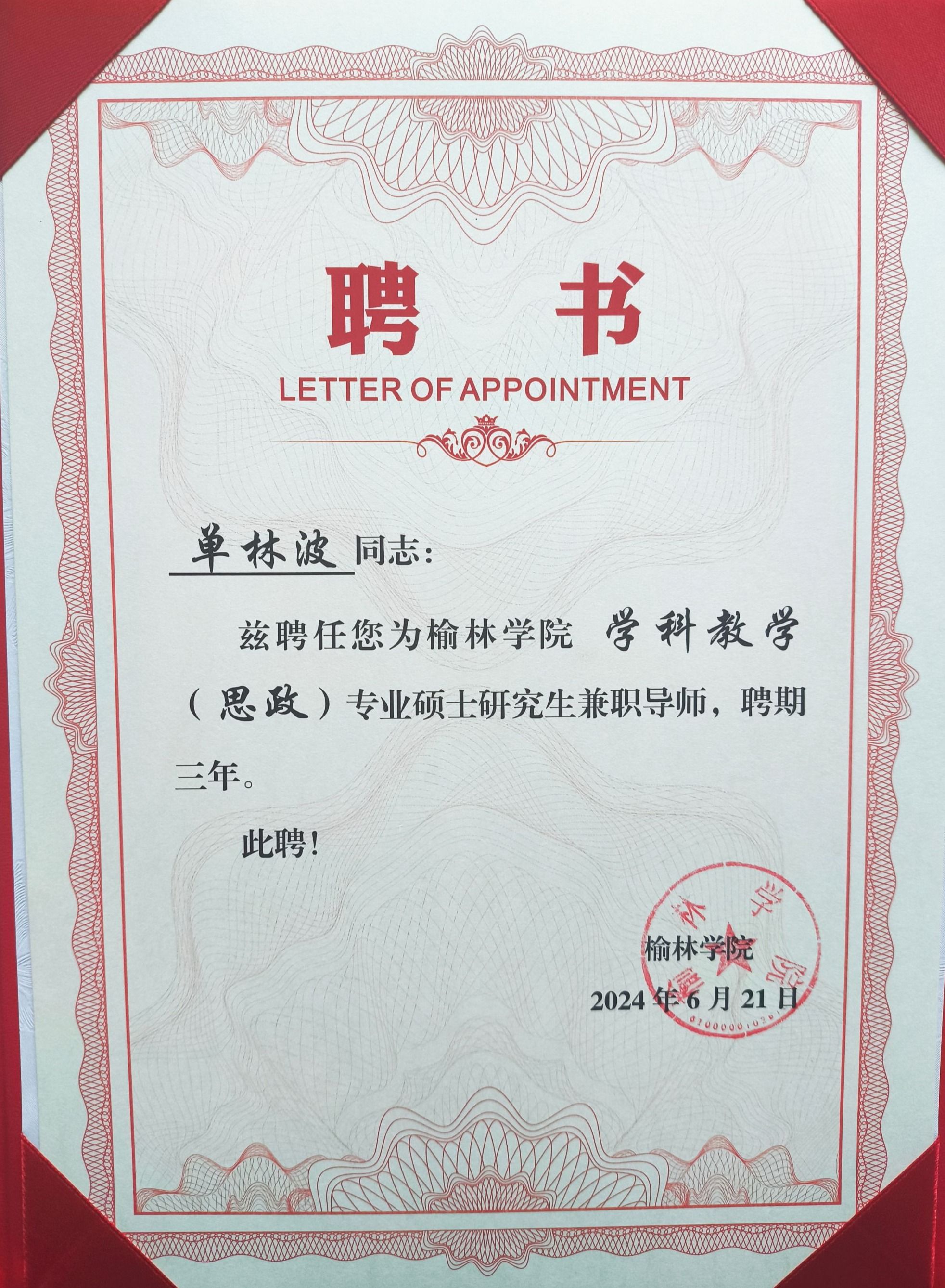 近日,接到榆林学院聘书,ac米兰单林波、王晓霞、房春艳、冯炜娟四位老师成功获聘为榆林学院学科教学(思政)兼职硕士生导师。至此,马克思主义学院兼职硕士生导师达到五人,这是马克思主义学院在学科专业建设与人才培养方面取得的又一重要成果。