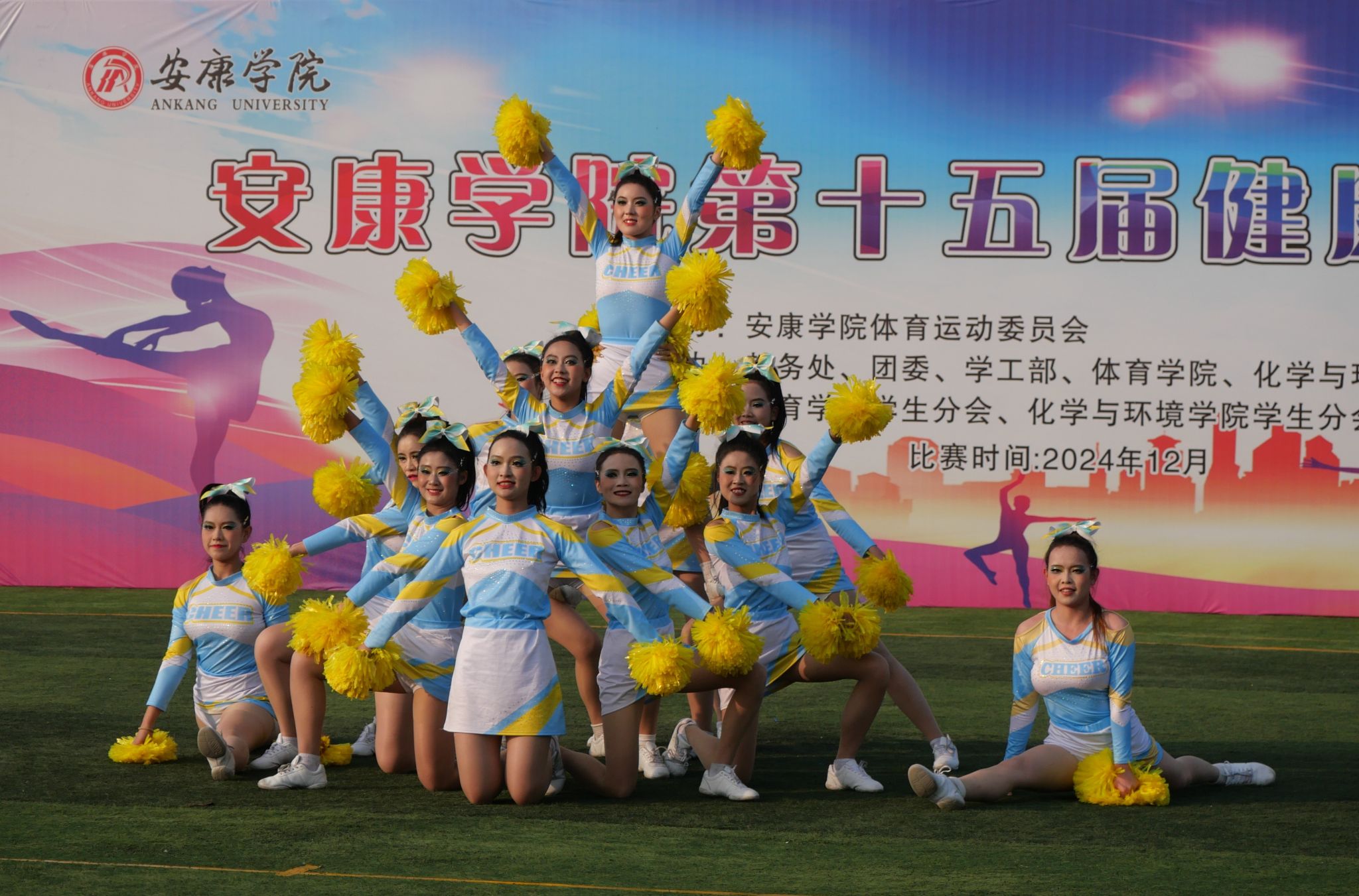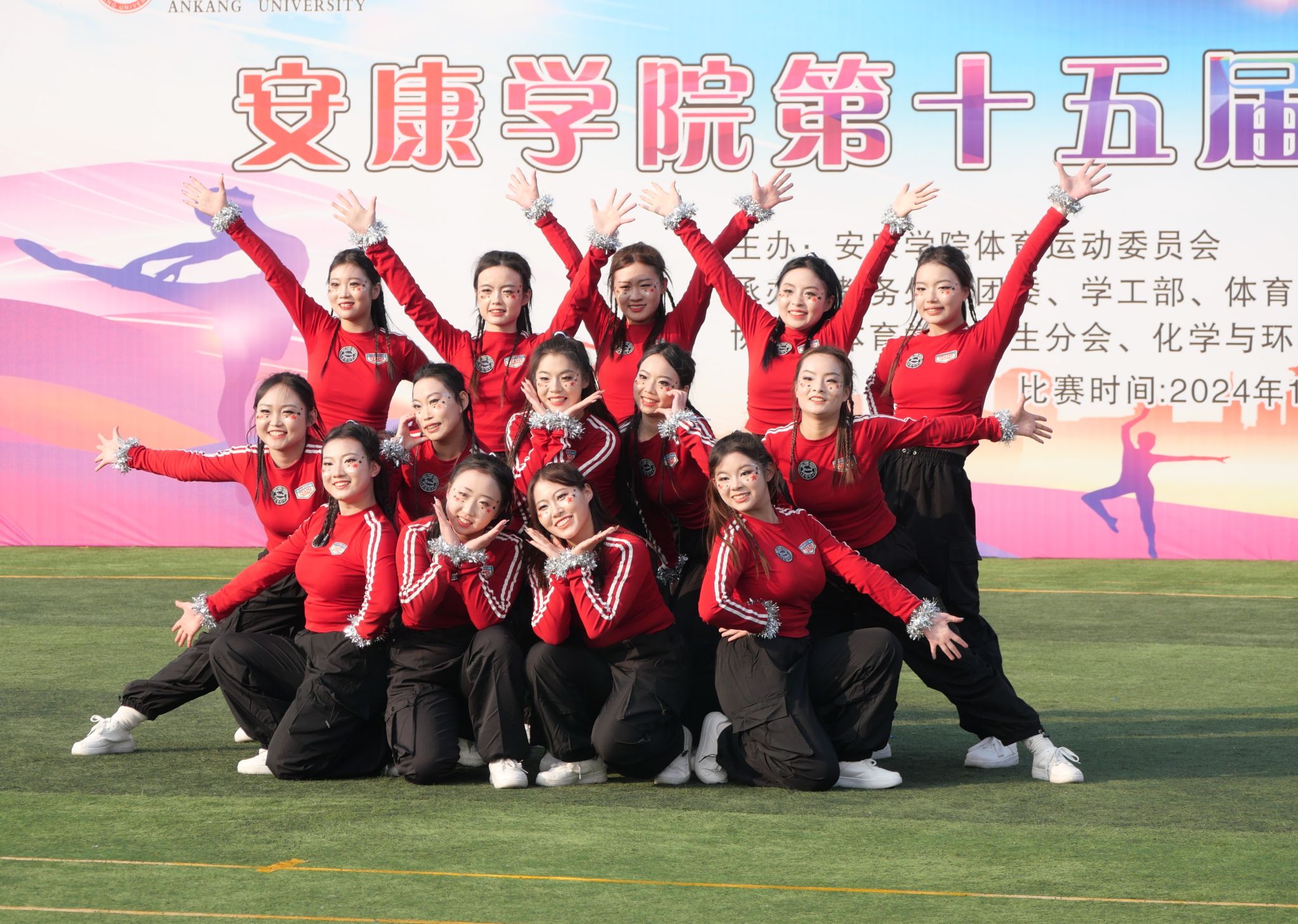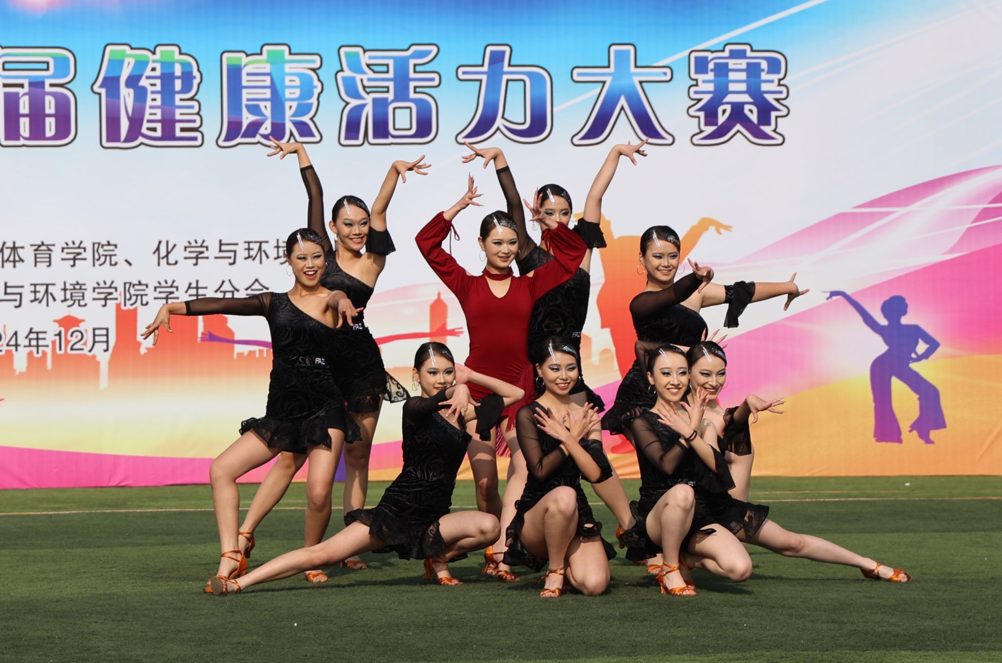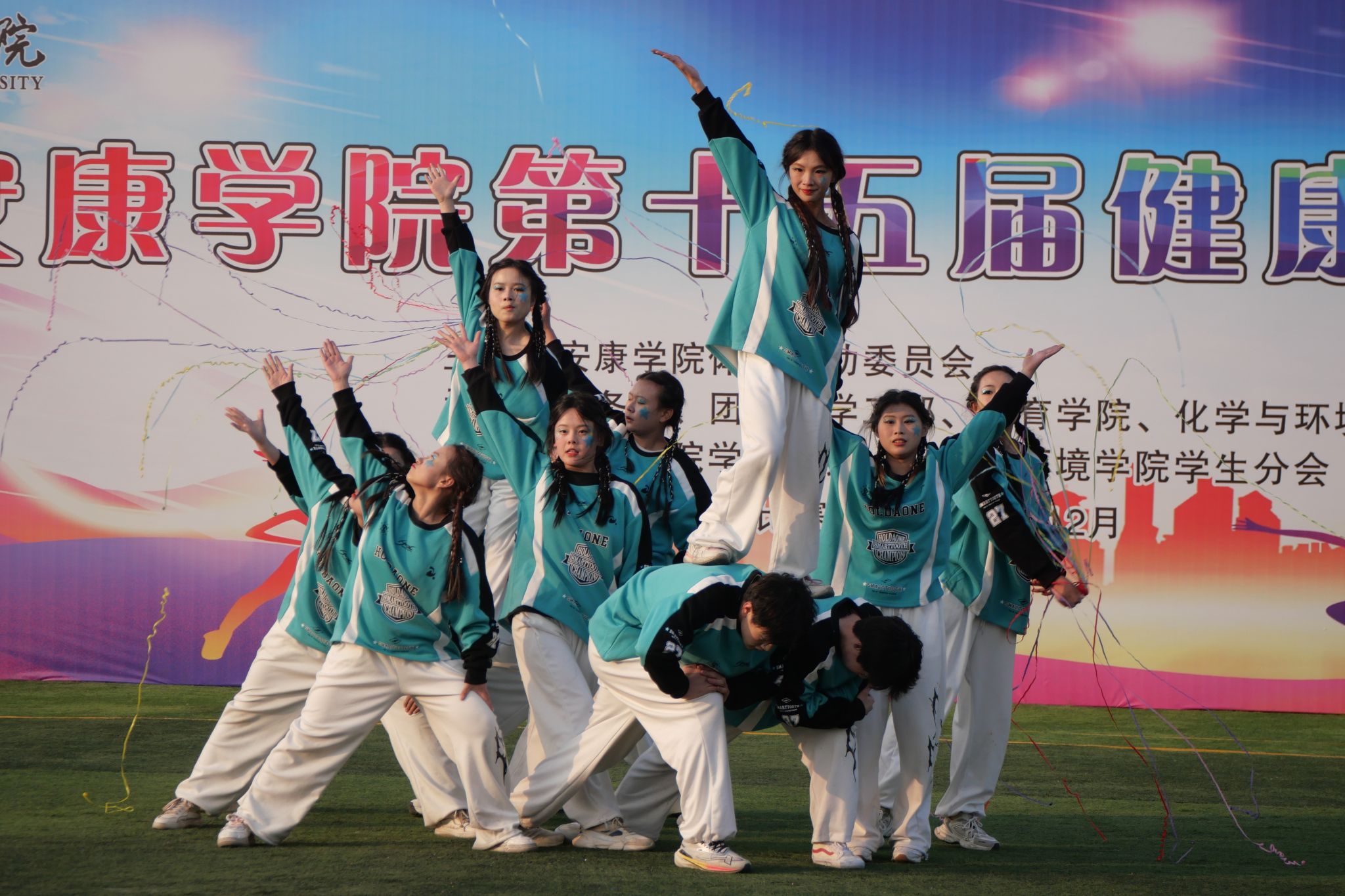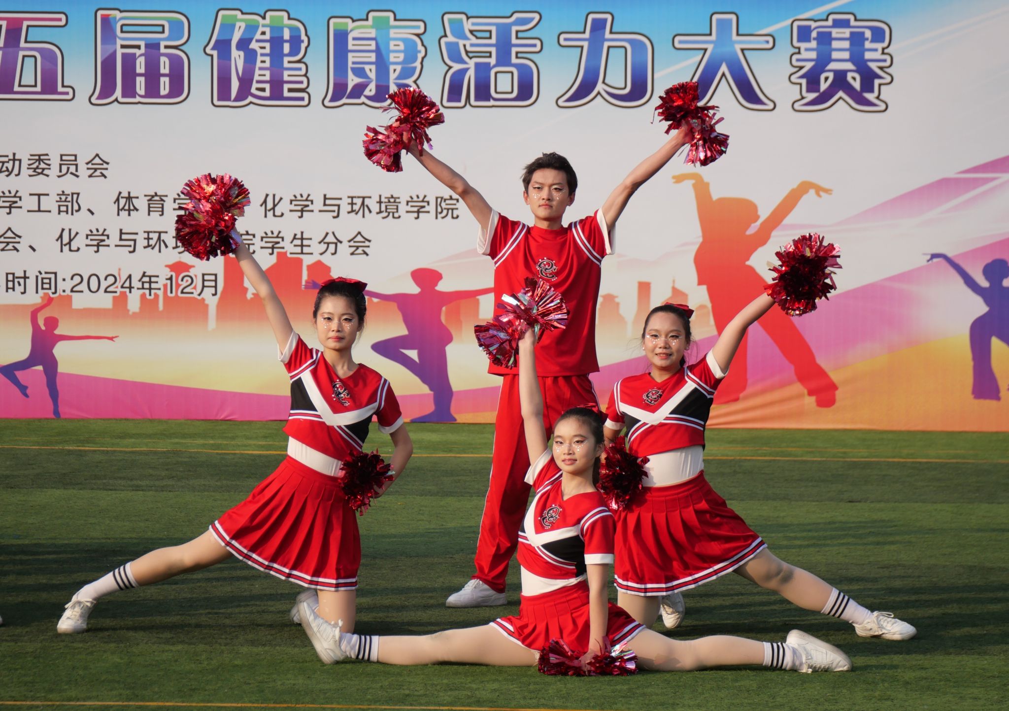 比赛现场,各参赛队一展青春风采,激情飞扬。伸臂、踢腿、旋转、跳跃……参赛选手们踏着音乐节拍,活力起舞,时而变换队形,时而做出托举、人塔、空翻、抛接等高难度技巧动作,创意十足的表演赢得观众阵阵喝彩。
