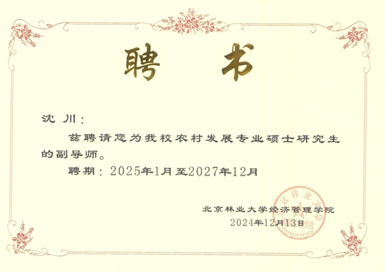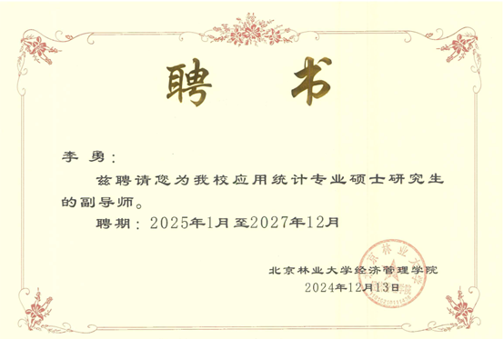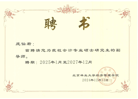 近日,根据北京林业大学硕士研究生指导教师遴选结果,ac米兰经管学院李勇、陈绪敖、李本庆、沈川、庞仙君五位教师获聘为北京林业大学经济管理学院硕士研究生副导师。至此,经管学院具有兼职硕士生导师达到8人,这是学院在学科建设与人才培养方面取得的又一重要成果。