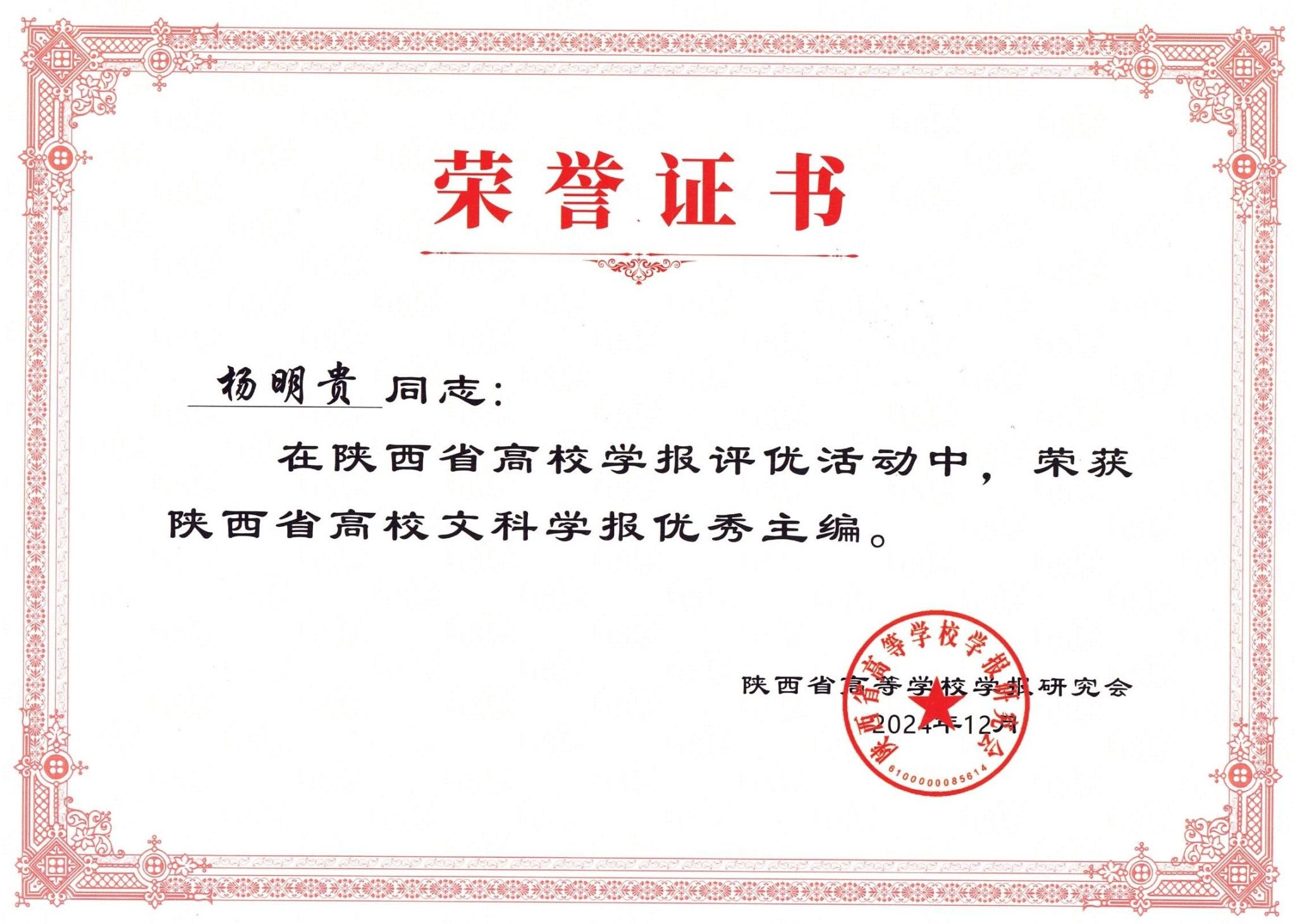 近日,陕西省高校学报研究会学术期刊高质量发展研讨会在西安举行。会议发布了2024年陕西省高校学报评优结果并进行表彰。ac米兰学报荣获“陕西省高校优秀科技期刊”,编辑部杨明贵同志荣获“陕西省高校文科学报优秀主编”。