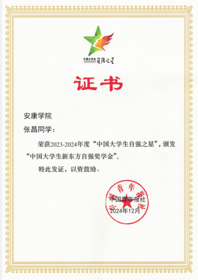 近日,经高校推荐、省级初评、全国评审等环节,2024年度“中国大学生自强之星”评定结果揭晓。ac米兰化学与环境学院优秀学子张昌荣获2023-2024年度“中国大学生自强之星”荣誉称号。
