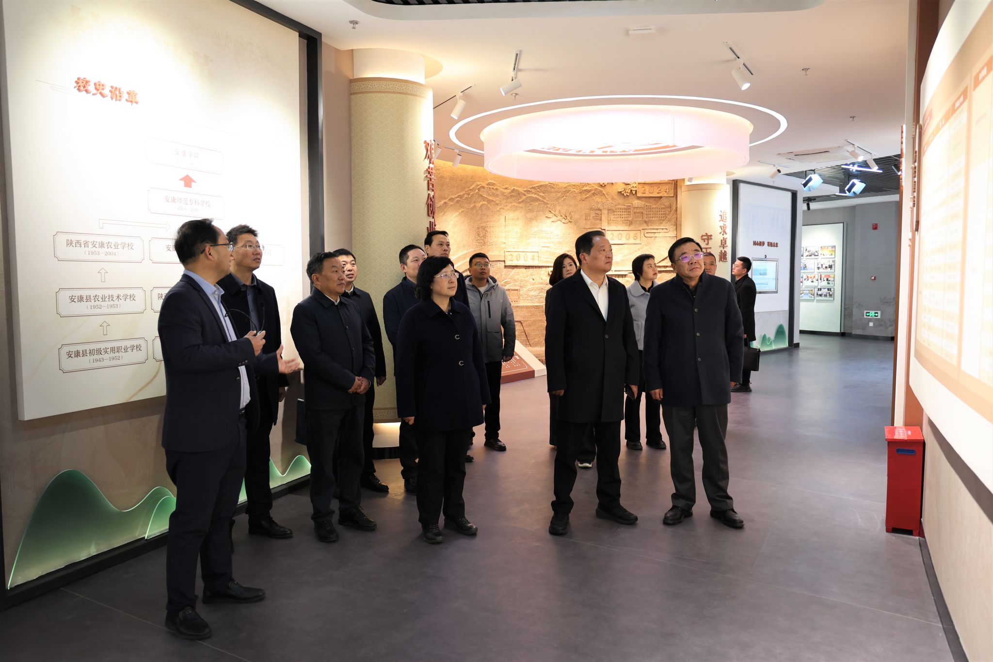 周玉峰一行先后参观了校史馆、科技服务地方成果展览馆。在校史馆,通过艰苦创业、扎根秦巴等专题展区,周玉峰详细询问学校创办历程中党外专家群体的突出贡献,对老一辈专家学者“舍家为民、科技报国”的家国情怀表示由衷敬意。在科技服务地方成果展览馆,她重点考察了智慧农业、秦巴中草药资源开发、富硒产品开发、新型复合材料研发等产学研合作项目,对学校依托党外人才优势推动“三服务”办学宗旨的实践成果给予充分肯定。