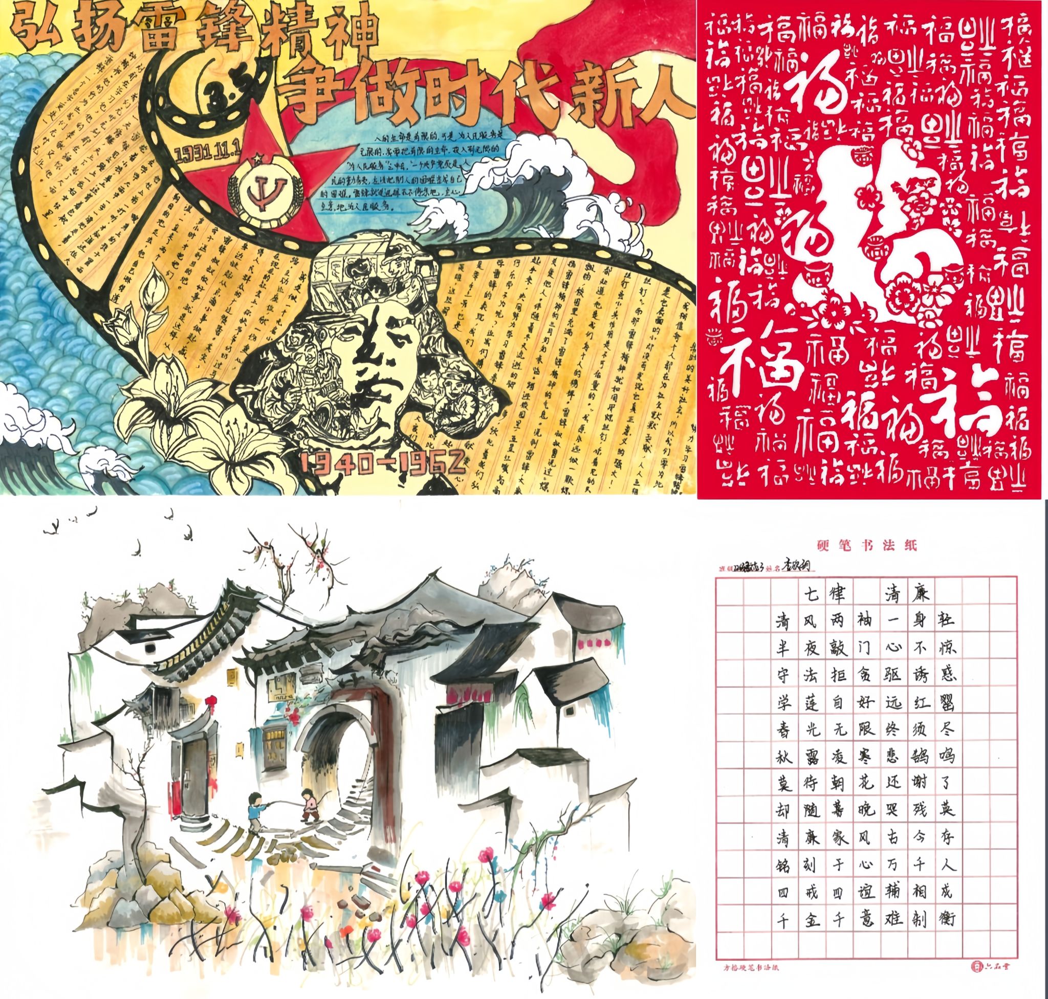 展览精心设置五个主题展区,各展区特色鲜明、精彩纷呈。在“我展画纸,绘就赤诚”手抄报展区,学生们以画笔为媒介,勾勒出坚定的理想信念;“我执笔墨,书写传承”三笔字展区中,一笔一划沉淀着文化基因,引发师生强烈共鸣;“我铺信笺,倾诉深情”展区里,一封封书信饱含真挚情感,诉说着内心故事;“彩纸叠民俗,色彩染吾乡”展区,剪纸与绘画作品巧妙融合传统文化元素,在守护传统的同时关照内心;“我用镜头,定格时光”摄影展区,一幅幅作品以光影为语言,记录下生活中的美好瞬间。这些作品以“小创意”为切口,生动讲述了心理健康教育与人才培养的“大故事”。