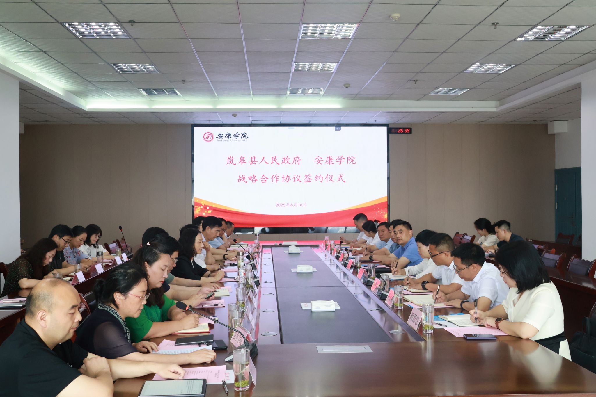 6月18日下午,岚皋县委副书记、县长王仁康一行来校商谈校地合作交流,校长余劲,副校长屈险峰、崔晓明陪同调研,相关职能部门及二级学院负责人参加座谈。