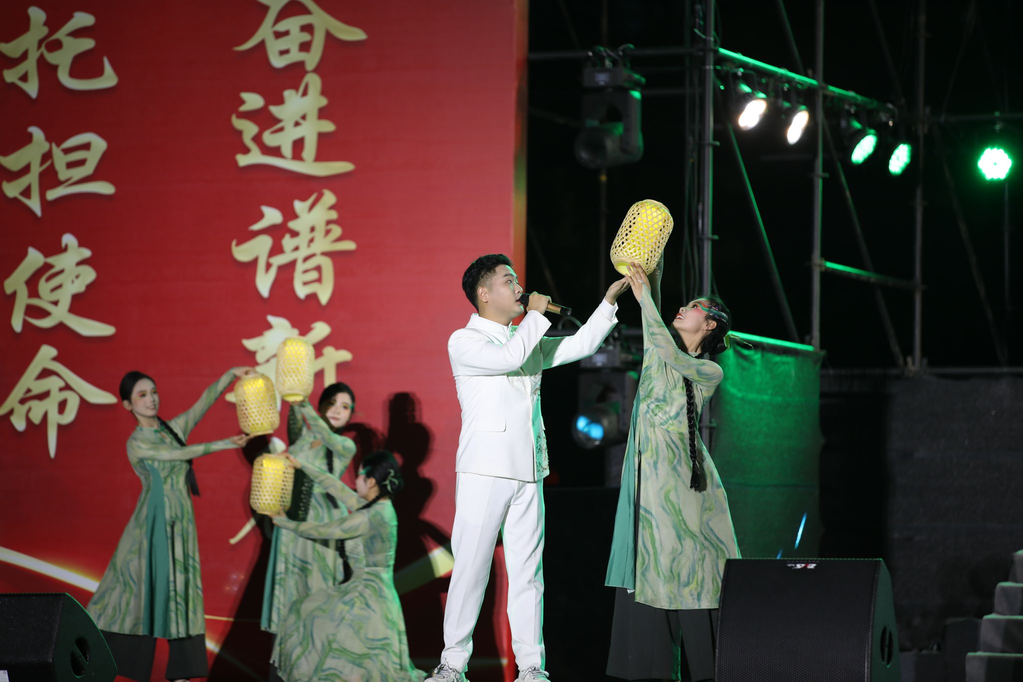 为呈现高质量的演出效果,艺术学院在接到任务后迅速组建工作专班,与高新区管委会办公室紧密合作,历时一个月精心打磨编排,师生们将对党的赤诚热爱与对地方发展的深切关注融入艺术创作与表演中。歌伴舞《大统战之歌》《大团结之歌》《母亲河》及合唱《领航》等节目贯穿“伟大征程、砥砺奋进、擎旗筑梦”三大篇章。80余名师生以饱满的热情、精湛的专业技能,通过悠扬的歌声与灵动的舞姿,生动诠释了统一战线的强大凝聚力、团结奋斗的时代精神以及对祖国母亲的深情眷恋,赢得了现场观众的阵阵掌声。其中,合唱《领航》的伴舞更是与全场大合唱完美融合,在激昂的旋律中为活动画上圆满句号,将现场氛围推向高潮。