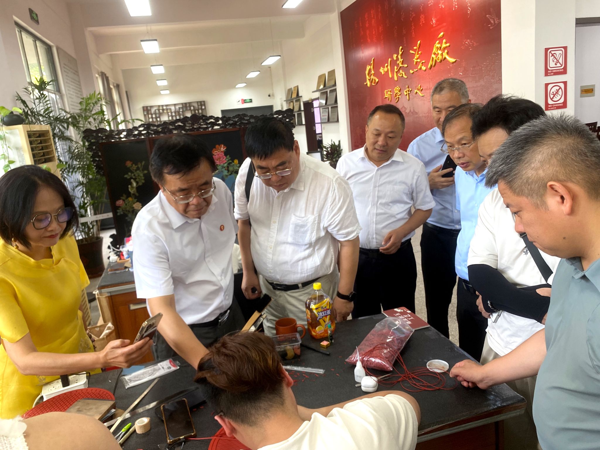 在扬州非遗珍宝馆,调研组参观了馆内的中国印刷博物馆广陵分馆、中国玉器博物馆、中国剪纸博物馆、漆器珍宝馆等,深入了解非遗珍宝馆建设方案和运行模式。