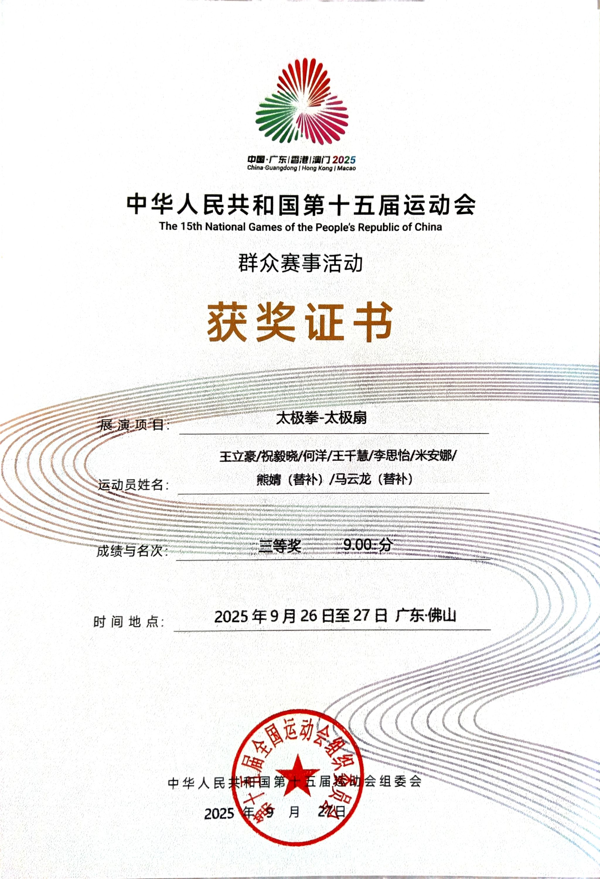 9月27日,中华人民共和国第十五届运动会群众展演太极拳项目决赛在广东佛山圆满落幕。ac米兰武术队9名队员凭借扎实的功底与出色的发挥,代表陕西省在太极扇集体项目中斩获铜牌,为陕西代表团及ac米兰官方网站赢得荣誉,这也是ac米兰在全运会群众体育赛事中取得的重要突破。