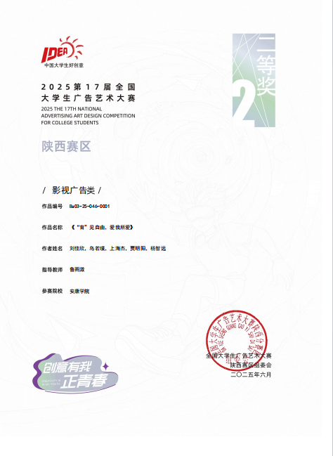 除微电影广告赛道外,在影视广告类作品评选中同样收获颇丰。鲁雨溦老师指导,刘佳欣、乌若璞、上海杰、贾明阳、杨智远同学创作的《“育”见自由,爱我所爱》,凭借独特的创意视角与精良的制作,荣获陕西赛区二等奖;张建涛老师指导,蒙智鹏、赵海东、马坤硕、杨哲同学创作的《“沃”来助你》,也以鲜明的主题表达,获评陕西赛区优秀奖。