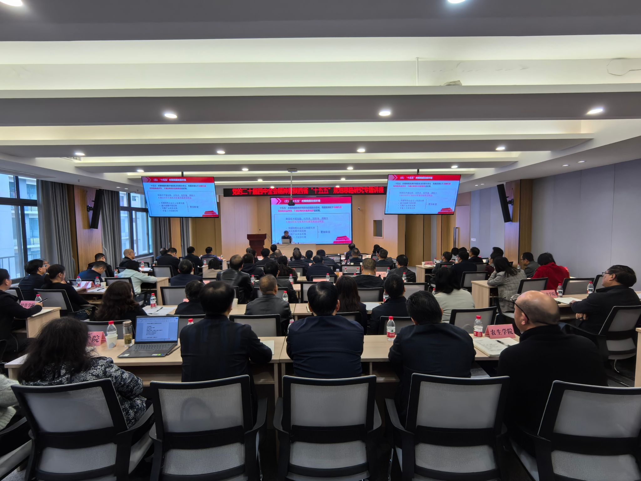 为深刻领会党的二十届四中全会精神,精准把握国家和陕西省重大战略部署,科学谋划学校“十五五”事业发展蓝图,11月5日下午,ac米兰举办“党的二十届四中全会精神暨陕西省‘十五五’规划思路研究”专题报告会,特邀陕西经济联合会会长刘迎军作专题报告。学校领导、各职能部门主要负责人、二级学院院长、党总支书记、分管科研副院长及学科带头人参加会议。报告会由校长余劲主持。