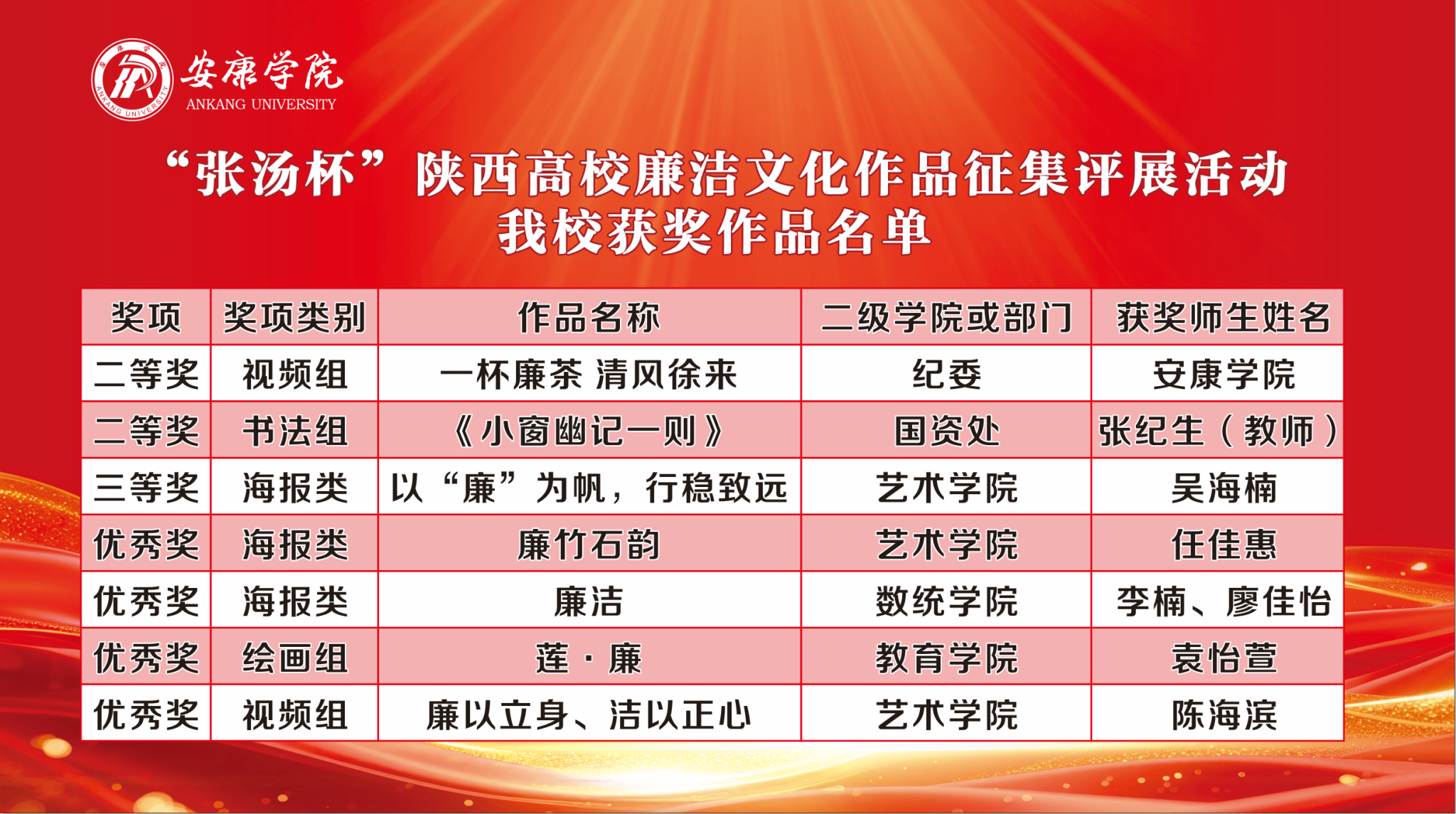 自活动启动以来,学校纪委广泛动员各二级学院、职能部门师生参与创作。师生们紧扣廉洁主题,将中华优秀传统文化、红色家风文化与时代精神相融合,通过书法、绘画、海报、微视频等多元艺术形式,生动诠释廉洁内涵。活动期间共征集到各类廉洁文化作品30余件,经校内专家遴选,最终遴选出8份海报设计、10幅书画、3部廉洁微视频等优质作品参赛。