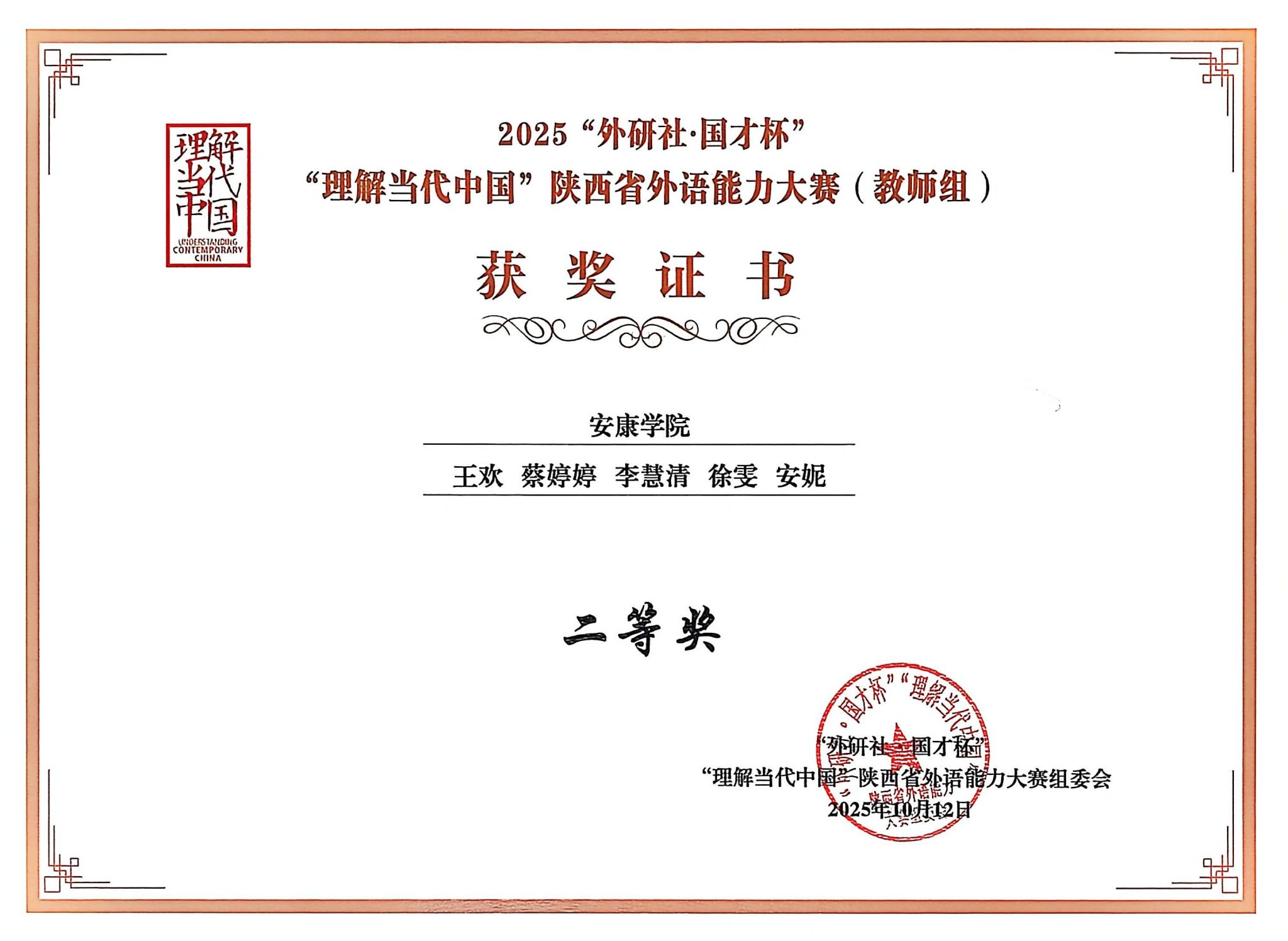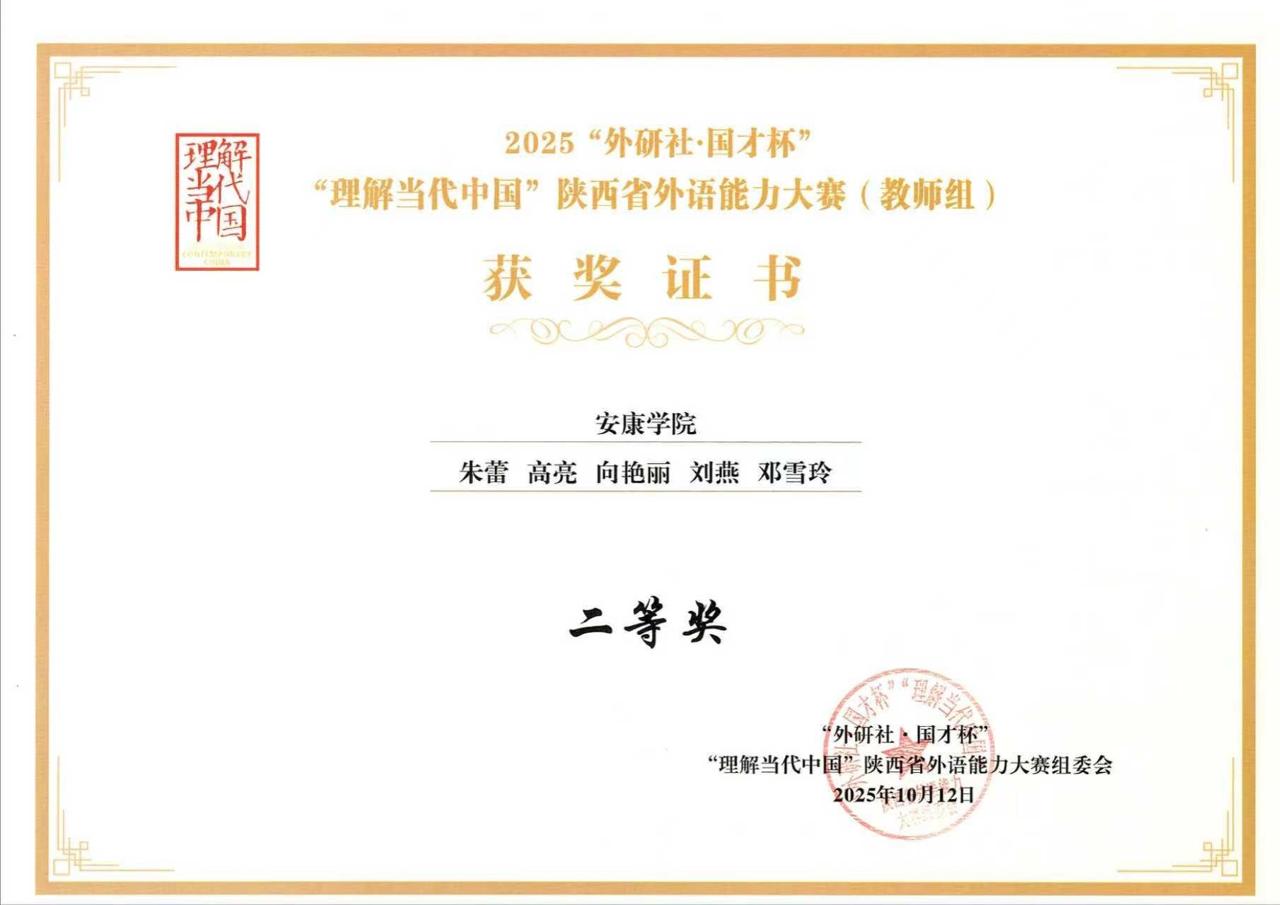 近日,2025“外研社国才杯”“理解当代中国”陕西省外语能力大赛(教师组)获奖名单公布,ac米兰外语学院英语专业教学团队(王欢、蔡婷婷、李慧清、徐雯、安妮)、大学英语教学团队(朱蕾、高亮、向艳丽、刘燕、邓雪玲)均荣获陕西省二等奖。