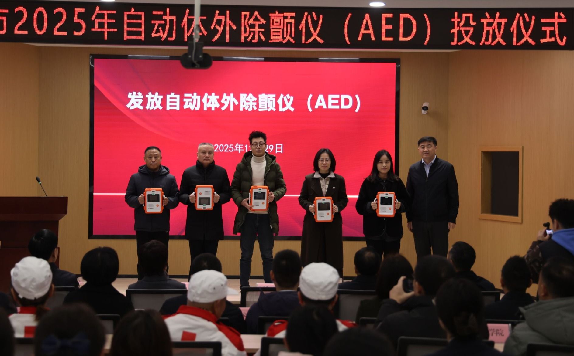 仪式由市红十字会常务副会长唐锦主持。屈险峰代表学校致辞,他对市委市政府及市红十字会的信任与支持表示感谢,并指出,AED投放是完善校园应急救护体系、保障师生生命安全的重要举措,学校将以此次活动为契机,常态化开展急救知识培训,切实筑牢校园生命健康安全屏障。杨首艳强调,本次AED集中投放仪式是践行“人民至上”理念的具体实践,希望各单位压实管理责任、建强救护队伍,让“小设备”真正扛起守护生命的“大担当”。