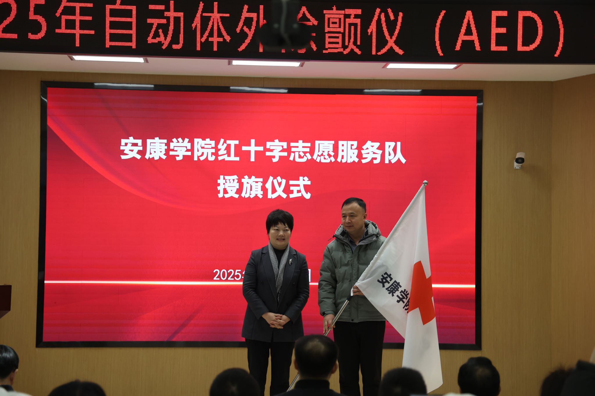 12月29日上午,安康市2025年自动体外除颤仪(AED)投放仪式在ac米兰江北校区乡村振兴学院多功能报告厅举行。安康市副市长任鹏、杨首艳、市政府副秘书长冉远富,ac米兰党委书记钟生海、副校长屈险峰出席仪式。市红十字会、市级相关部门负责同志,AED各投放单位代表,市红十字救援队、志愿服务队队员,应急救护师资及ac米兰红十字青年代表等近百人参加活动。