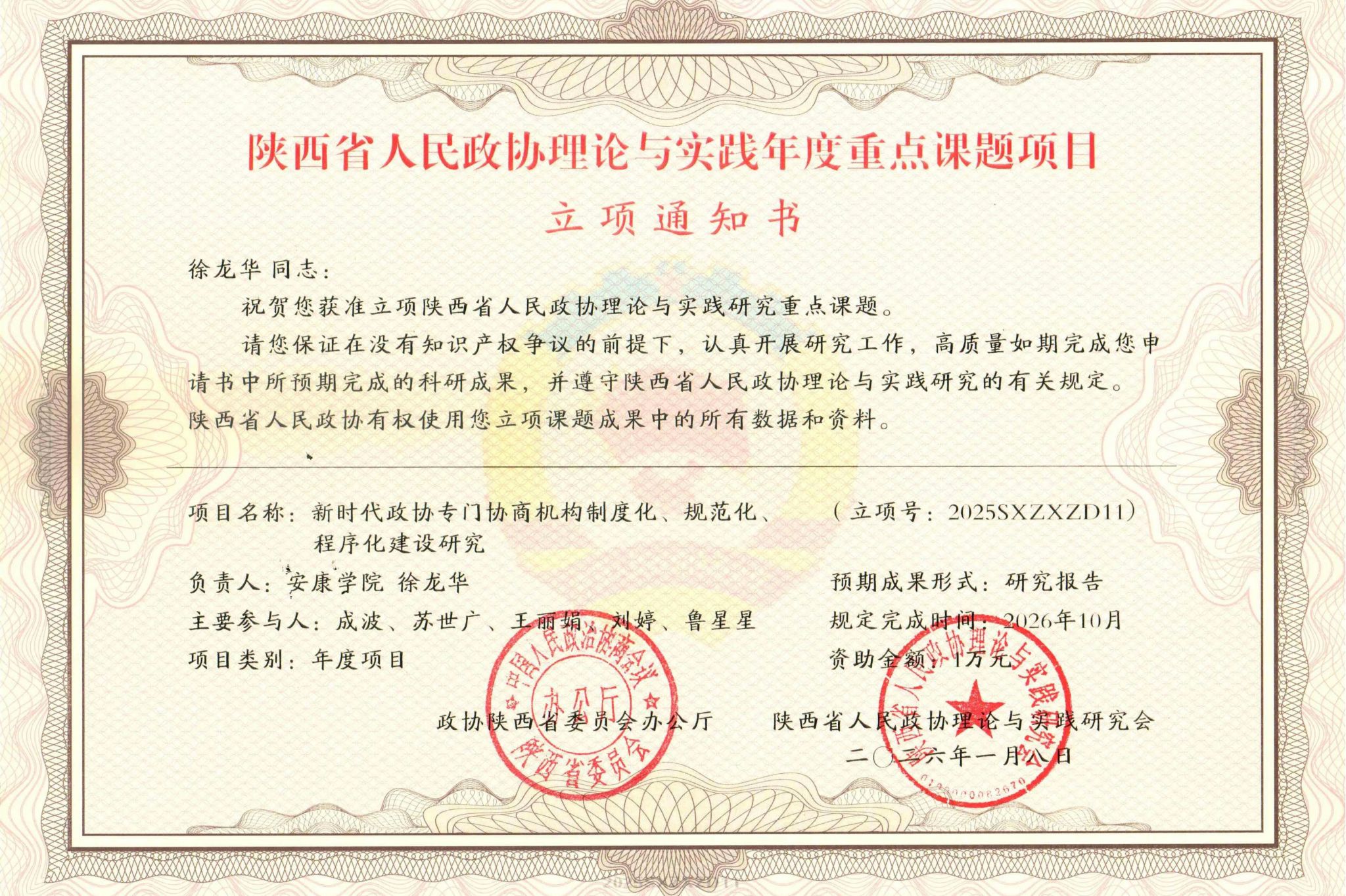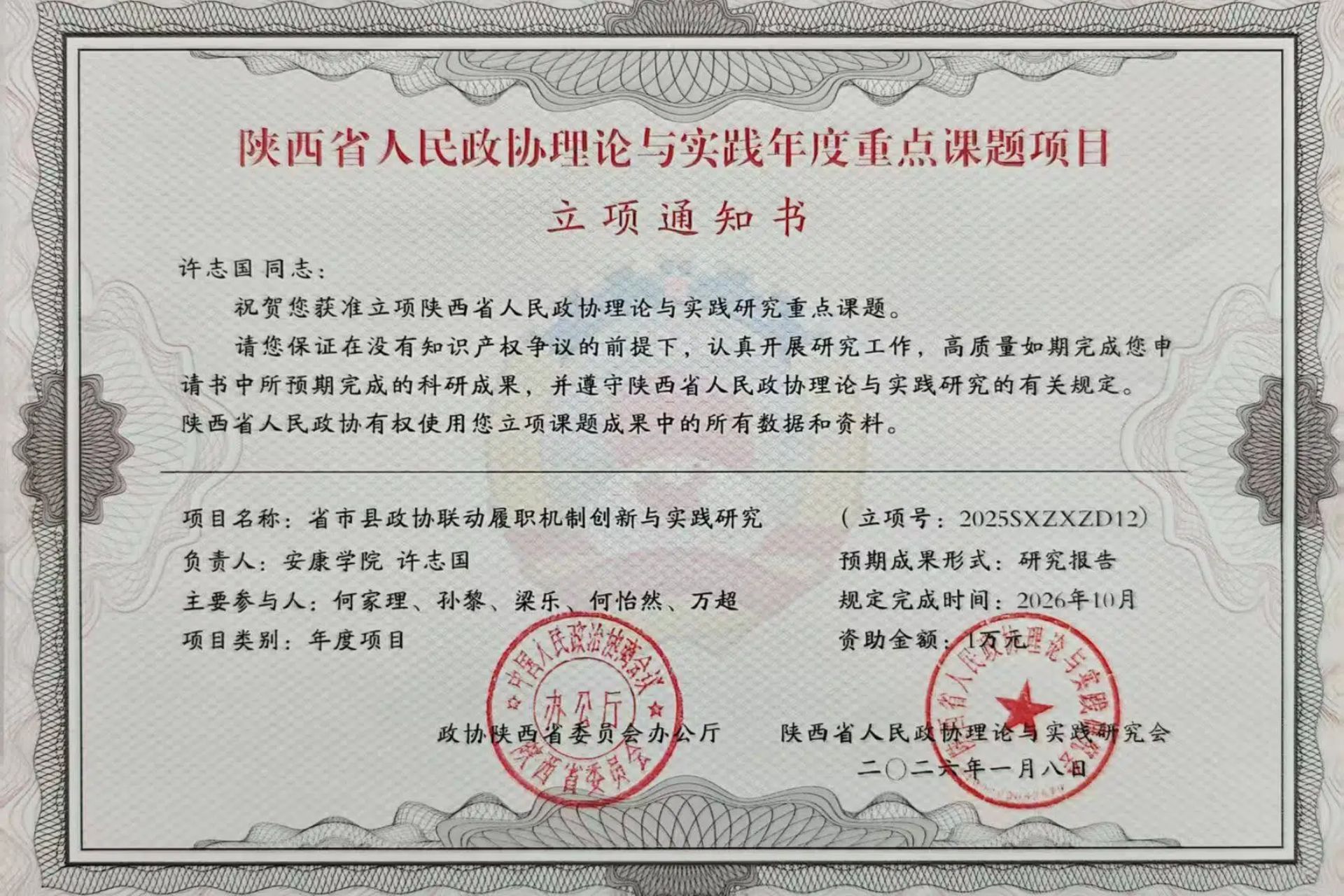 近日,ac米兰陕西省人民政协理论与实践研究基地组织申报的《省市县政协联动履职机制创新与实践研究》与《新时代政协专门协商机构制度化、规范化、程序化建设研究》两项课题,成功获批2026年度陕西省人民政协理论与实践重点课题项目,标志着基地在人民政协理论研究领域取得新的突破。