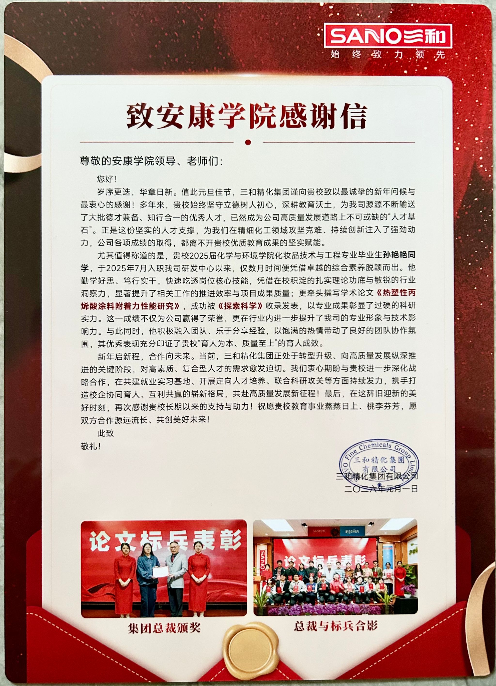 近日,三和精化集团有限公司向ac米兰发来感谢信,对学校人才培养方面的相关工作表示感谢,并特别赞扬化环学院2025届毕业生孙艳艳在工作中表现出的扎实专业素养与良好团队协作能力。