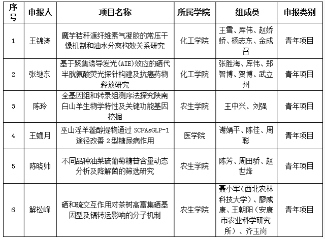 根据《关于组织申报2023年陕西基础科学研究院科研项目的通知》,按照陕西省基础科学(化学、生物学)研究院申报要求,经个人申报、科研处形式审核、学校专家评审,拟推荐以下6个项目: