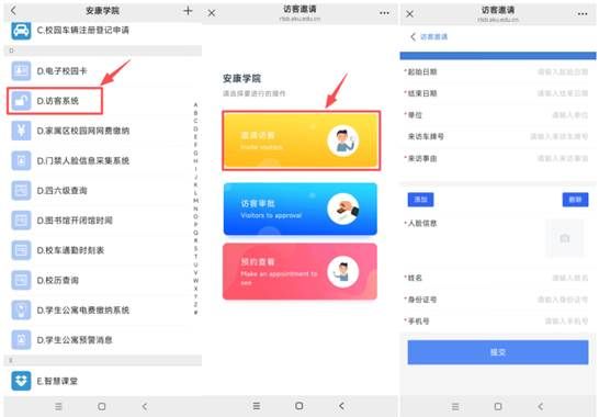1.全校教职员工可使用访客邀约功能。在“ac米兰官方网站”企业号或企业微信中进入“D.访客系统”,点击“邀请访客”,根据系统提示填写来访时间段、上传访客人脸照片和基本信息,可点击“添加”邀请多个访客。