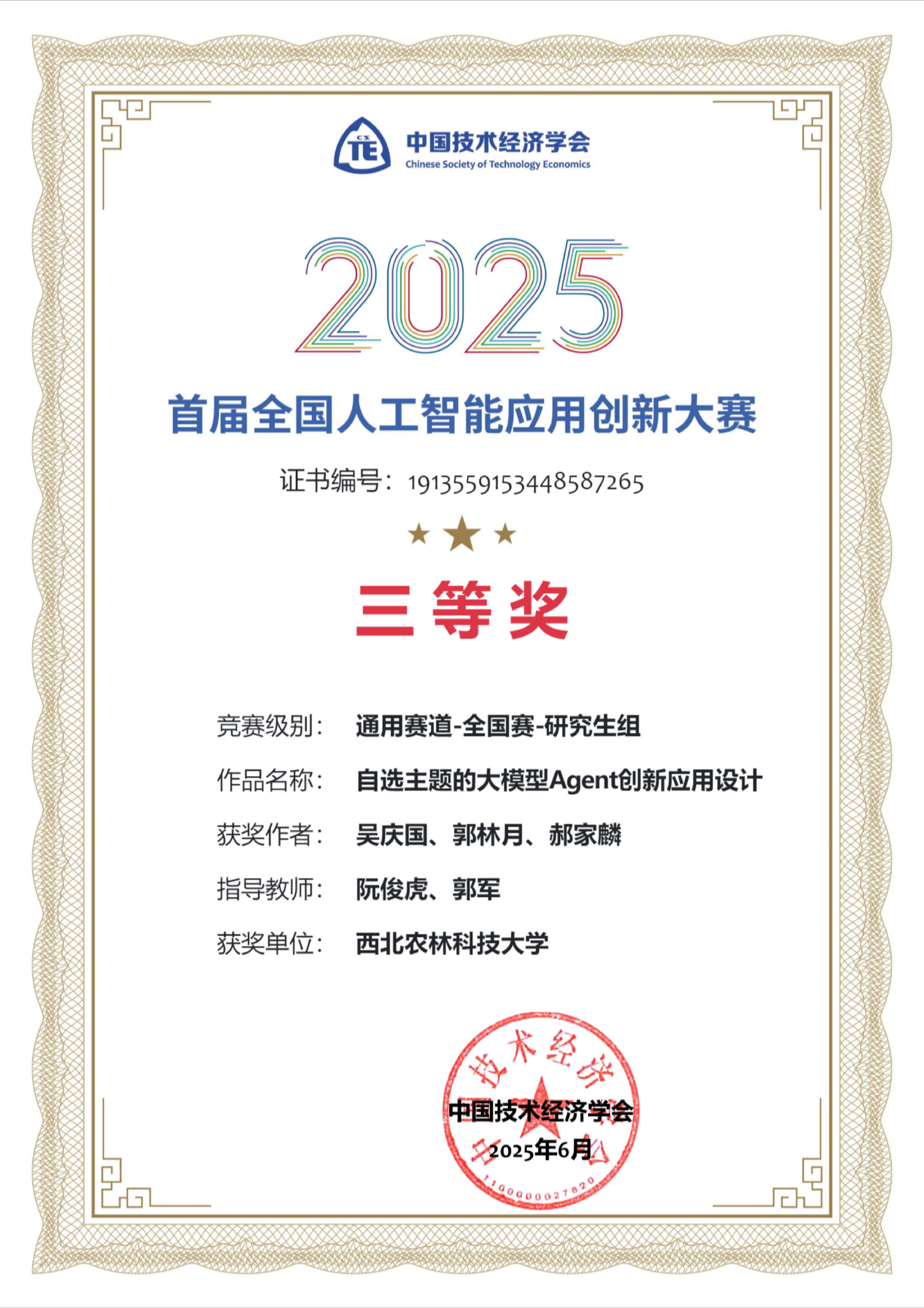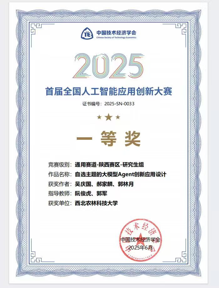 今年6月底,由中国技术经济学会主办的2025首届全国人工智能应用创新大赛圆满落幕。伟德betvlctor国际官网阮俊虎教授与植物保护学院郭军教授共同指导的研究生团队(队长:吴庆国,队员:郝家麟、郭林月),凭借《后稷农业大模型·御锈》项目,在激烈竞争中脱颖而出,一举斩获通用赛道研究生组陕西省一等奖与全国总决赛三等奖,彰显了团队在人工智能应用领域的探索能力与创新水平。