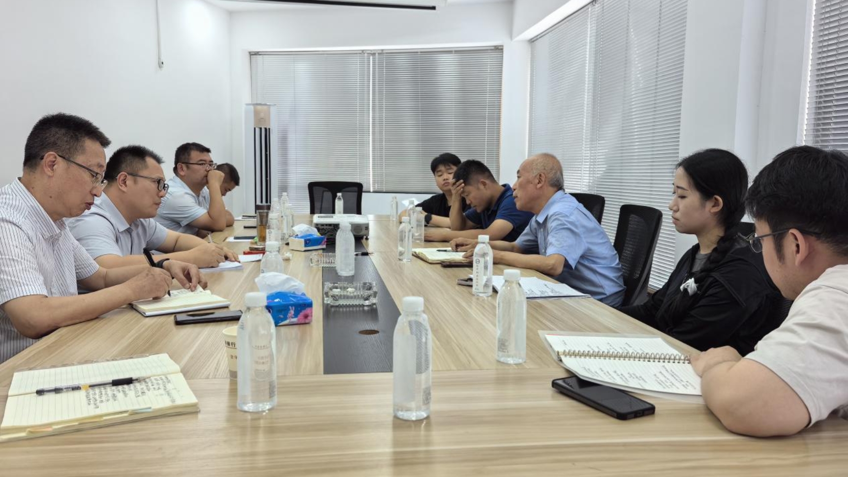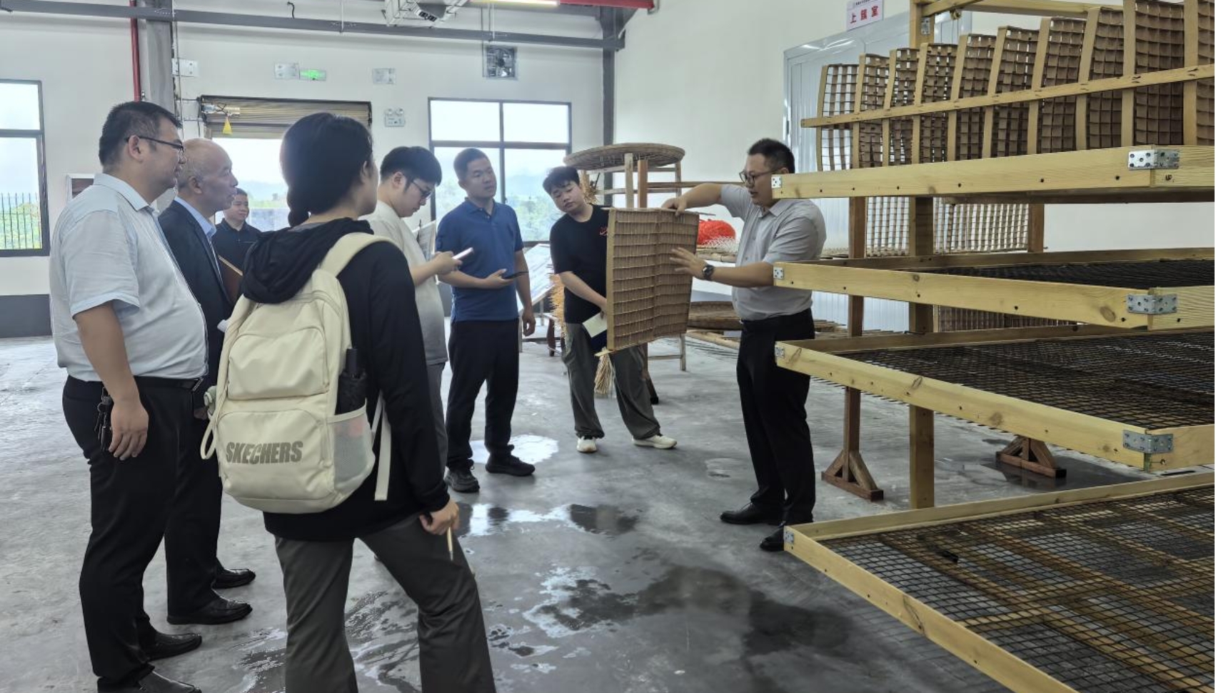 上午,团队前往智能化小蚕共育示范中心,工作人员演示了育蚕智慧管控系统,并对小蚕共育阶段改良的蚕台、方格簇等设施进行了交流介绍。之后,团队前往蚕茧交易智能化收烘中心,与各单位代表针对全维数智管理系统——包括自动检测收茧机器、数智蚕桑指挥调度中心、可视化环境物联智控平台、智慧蚕桑生产管理等系统展开调研交流,直观了解数智桑蚕产业管理的优势与需求。同时,团队成员围绕“后稷农业大模型·智牧”在桑蚕产业中的应用场景进行了探讨,为后续与智慧桑蚕产业的结合提供了思路方向与理论支持。