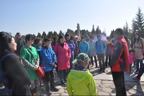 大家还参观了唐朝第四代第五位皇帝唐睿宗李旦的陵寝——桥陵。这座修建于唐朝开元年间,花费当时国库三分之一的陵墓,是后人体察盛唐政治、经济、文化的窗口。在桥陵,我们有幸请到陕西最牛导游解说专家——朱建武,朱导用他标志性的“秦人风格”(陕西话),向我们绘声绘色地描述了一千三百多年前这片土地上曾经真实出现过的雄伟风貌。从神道两旁的獬豸、石马、翁仲,从神道尽头的石狮、两旁的阙楼遗存,从远处连绵起伏的凤凰山头……依稀看见了那个博大、包容的唐朝开元盛世。