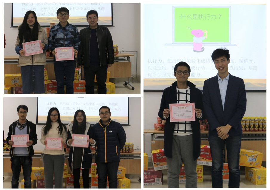 本次素质拓展活动的主要内容是以“沙漠掘金——从决策到执行”为题的“高绩效团队与执行力提升沙盘模拟演练”。活动伊始,刘毅老师为大家详细的讲解了沙盘演练的游戏规则——在团队协作的条件下,通过人员、财物、负重的合理组合,想象自己在沙漠中按地图路线从起点走到终点,并且带回尽可能多的金块。同学们自由组合成六个小组,起好队名后开始设计行进路线。经过一番激烈的讨论,每个组都完成了初期的规划,紧接着,各组按照自己既定的执行方案开始了本组的“沙漠淘金之旅”。活动过程中,有的组因为准备不充分,甚至没有到达金矿就“渴死在路上”,而有的组前期做好了充足的准备,成功采到金块并顺利返回终点。最终,“步步金心队”凭借良好的团队协作,灵活的应对危机措施,特立独行的营销手法获得了冠军。