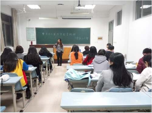 袁涵首先传达了党的十八届六中全会精神和省委六届十一次全会精神,带领与会人员认真研读《中共第十八届中央委员会第六次全体会议公报》。袁涵指出,党员要牢固树立核心意识和看齐意识,坚决拥护、坚决维护习近平同志在全党的核心地位,始终在思想上、政治上、行动上同以习近平同志为核心的党中央保持高度一致,做到思想上绝对忠诚、组织上自觉服从、行动上坚定紧跟。支部成员对十八届六中全会的内容有了进一步的认识,也明确了作为一名大学生党员今后努力的方向。党的十八届六中全会是一次继往开来、承前启后的重要会议,必将以其重大的历史意义、重要的历史地位和特殊的历史贡献,永载我们党的光辉史册。支部成员童磊在会议之后说:“我们作为当代大学生,更加需要在这特殊的时期坚定信念、锐意进取、奋发有为,紧密团结在以习近平同志为核心的党中央周围,努力集中力量把自己的事情做好,不断开拓新境界,为实现中华民族伟大复兴的“中国梦”而奋斗终生!”