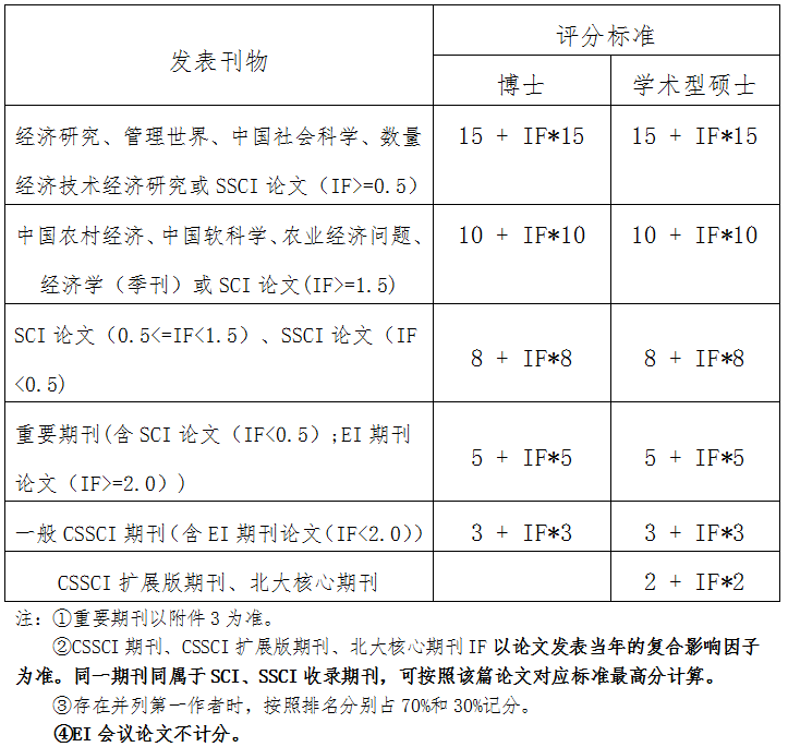 发表论文必须满足研究生在读期间发表,并且本人为第一作者,导师为通讯作者(有些期刊不标注通讯作者时,共同作者中需要有导师),伟德betvlctor国际官网为第一署名单位;若符合其它条件(第一作者、第一署名单位)但论文中无导师者,按照该篇论文计算总分乘以0.6的系数核算。其中,北大核心和CSSCI论文以录用通知、收费证据(需导师签字审核确认)或期刊原件为准,三大检索论文(SSCI、SCI、EI)以录用通知或论文原件为准。上一年度已经参与学业奖学金评定的论文成果不允许二次使用,一经发现,直接降为三等。期刊等级及影响因子以论文录用或见刊当年为准。具体评分标准如下: