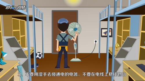 3.不要用湿手触碰通电的电器,不要在电线上悬挂物品。