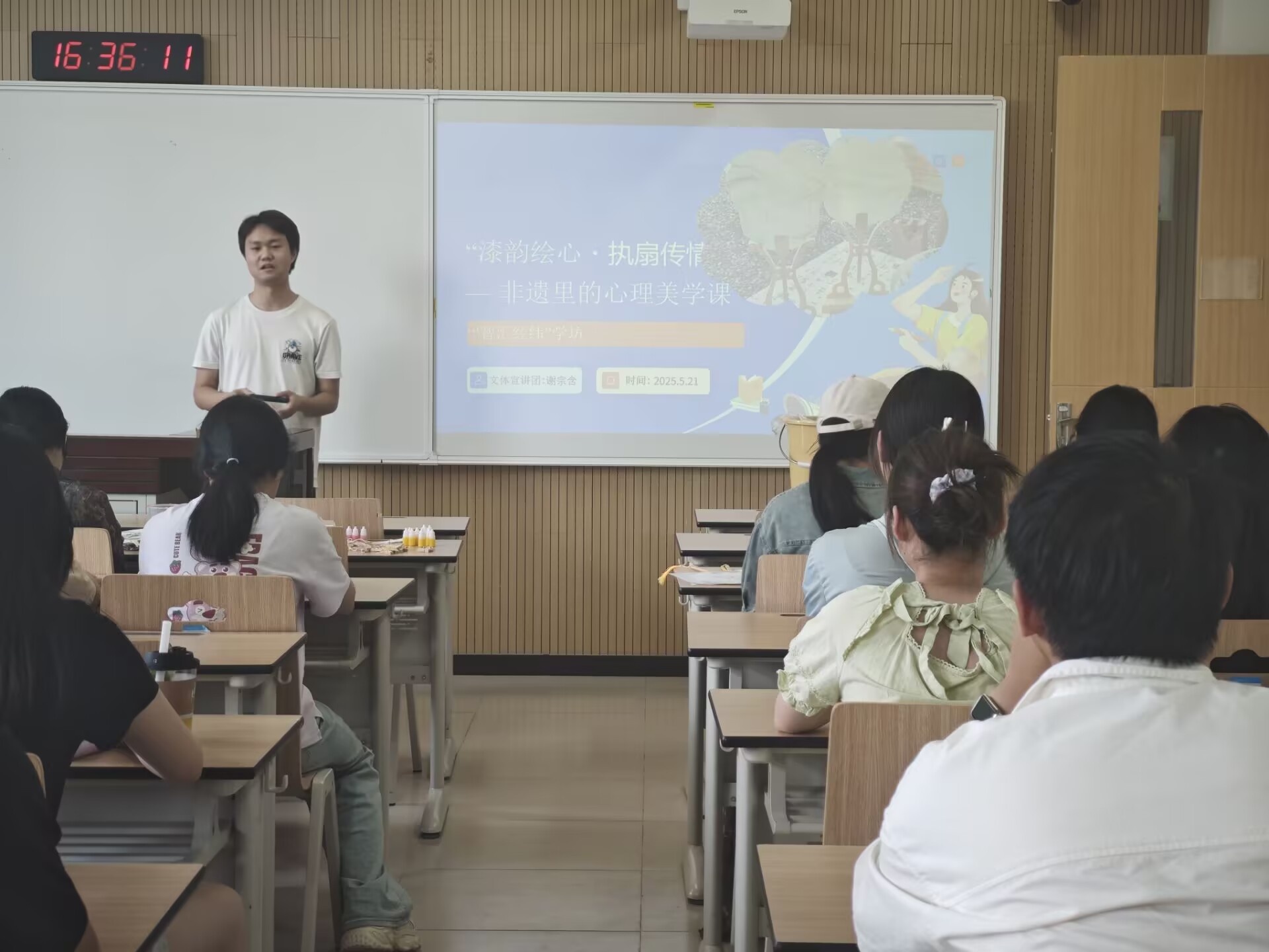 漆香阵阵,扇韵悠悠。5月21日下午,伟德betvlctor国际官网心理权益部联合“智汇经纬”文体活动体验坊,在南校一号教学楼成功开展“漆韵绘心·执扇传情”非遗心理美学体验活动,60余名同学在非遗漆扇的魅力中,感受千年技艺的文化底蕴,体验漆墨流彩的心灵疗愈。